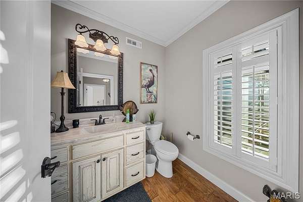 Additional main-level features include a foyer with hardwood floors and plantation shutters, a guest bedroom with matching finishes, and a laundry room with tile flooring.