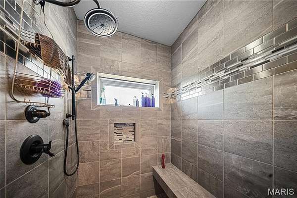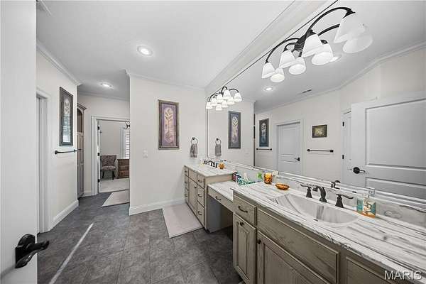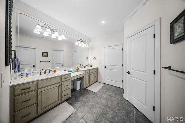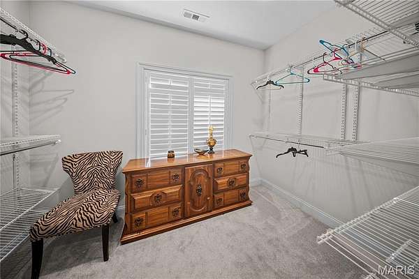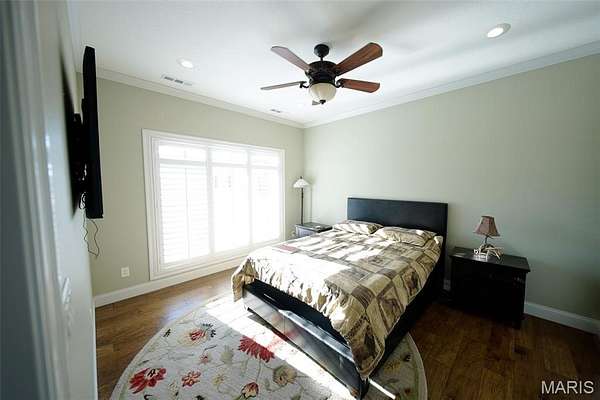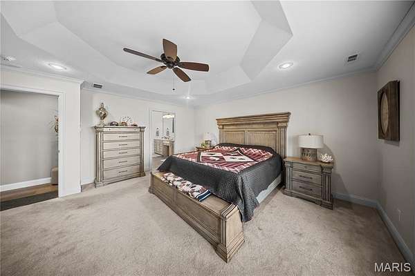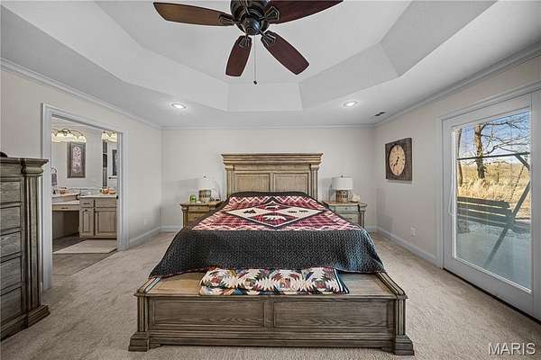 The main-level master suite is designed for privacy and comfort, offering carpeted flooring, a walk-out door to the patio, and peaceful views of the property. The attached master bathroom includes double vanity sinks, tile flooring, a very large walk-in tile shower, custom cabinetry, and a spacious walk-in closet.