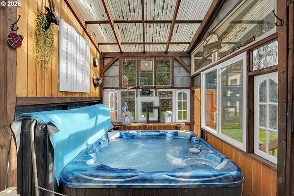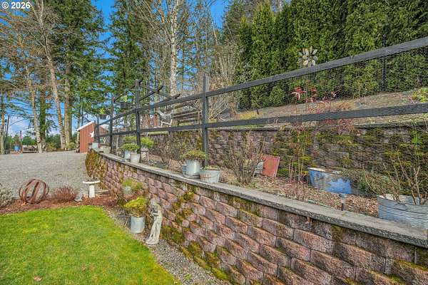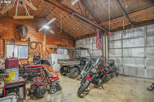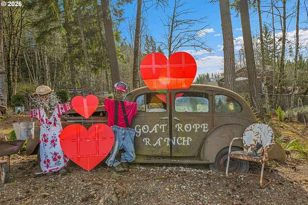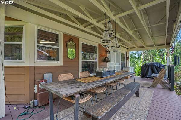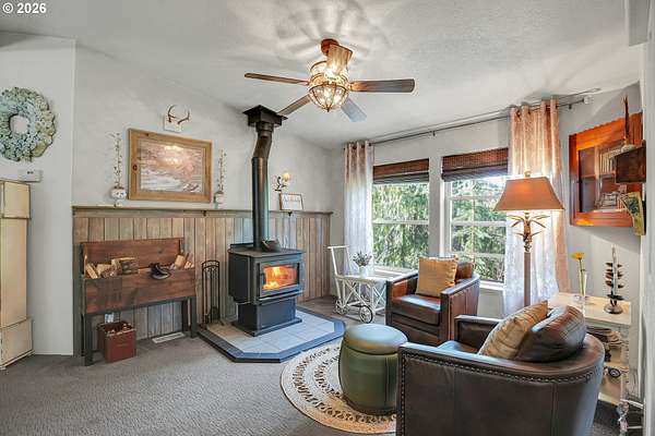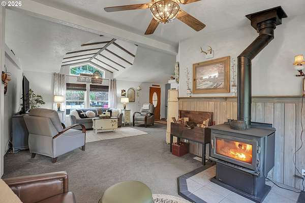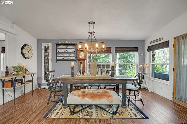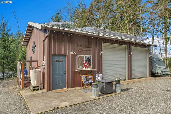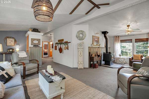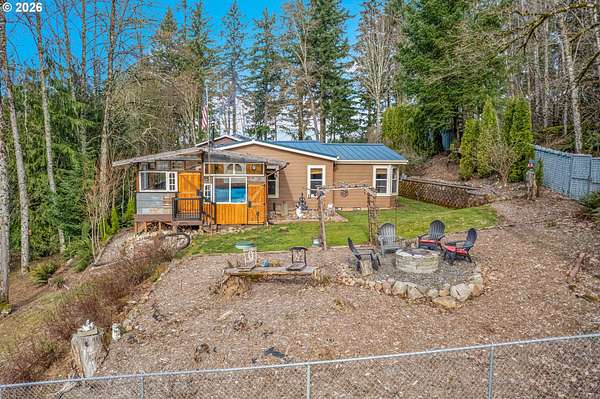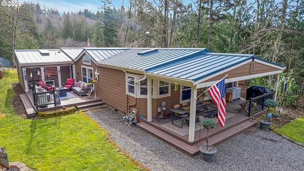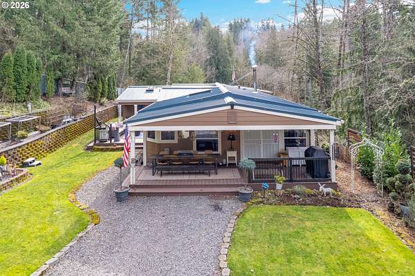 Set on nearly 4 acres, this beautifully maintained 3-bedroom, 2-bath manufactured home offers over 2000 square feet of comfortable living space. Upon your entry, the expansive great room includes a large kitchen with generous cabinet space, pantry, island, and adjoining dining area - perfect for hosting gatherings. The oversized living room offers vaulted ceilings, large windows, two sitting areas, and a cozy woodstove, creating a warm and welcoming atmosphere.Retreat to the generously sized primary suite, complete with a separate sitting area, walk-in closet, bay windows and a private bath with double sinks and soaking tub. Two additional bedrooms and a full bath provide flexibility for guests, home office, or hobbies.Outside features multiple outdoor spaces to enjoy, including a covered front porch, an open side deck ideal for stargazing, relaxing by the fire, or game nights, and a covered, enclosed area with hot tub for year-round enjoyment. The property also features wonderful gardening areas, room for animals, and expansive open space to make your own.A large shop with two roll-up garage doors offers exceptional storage and workspace, along with ample parking for RVs, boats, and toys. Additional upgrades include solar panels on the garage for energy efficiency and a newer metal roof for long-term durability.This private retreat combines comfort, functionality, and outdoor lifestyle-just minutes from Estacada amenities while offering the tranquility of country living.