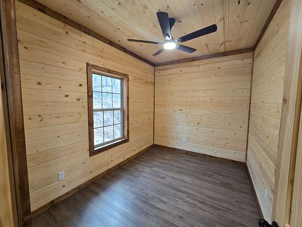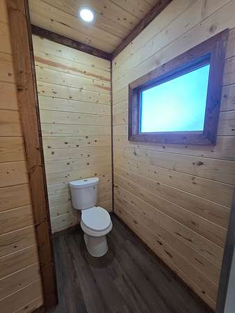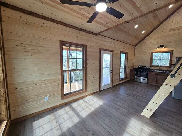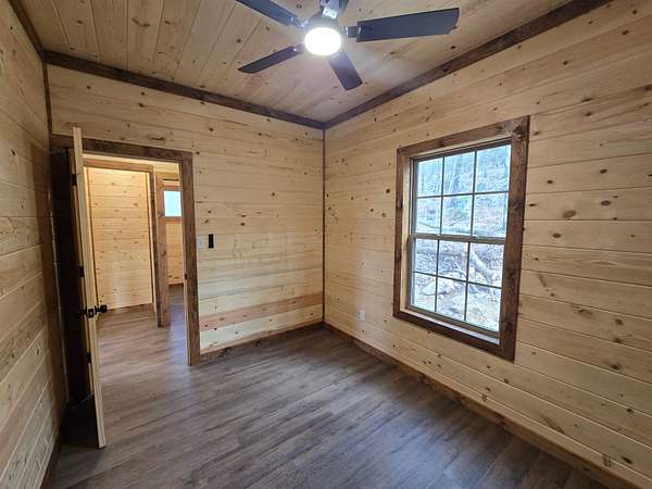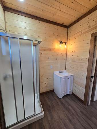 O Cabin interior finished out with rustic tongue and groove knotty pine and vinyl plank flooring.
