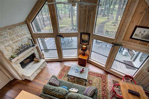 The home itself is warm & inviting with vaulted, beamed ceilings, Brazilian Lyptus hardwood floors. Expansive lake-view windows create a stunning lakeside atmosphere. A custom stone wood-burning fireplace is perfect for winter holidays spent relaxing and indoor games.