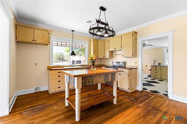 Escape to the tranquility of the Texas countryside with this beautifully preserved 1920s ranch-style home for sale in Dale, TX, just 30 minutes from Austin. Set on nearly 10 acres of unrestricted land, this 3-bedroom, 2-bathroom country home blends timeless vintage character with thoughtful updates, offering the perfect retreat for those seeking peaceful rural living close to the city. Step inside to find original hardwood floors, fresh paint, and classic black-and-white tile that reflect the home's historic charm. The spacious living room welcomes you with a freestanding cast iron wood-burning fireplace, high ceilings, and original moldings that showcase the craftsmanship of a bygone era. The open-concept kitchen connects to both the dining and living areas and features antique beadboard cabinetry and a stunning antique butcher block island-ideal for home-cooked meals and entertaining. Natural light floods the dining space through quaint divided-light windows, creating a warm and inviting atmosphere throughout. Enjoy outdoor living on the charming front porch or relax on one of two side porches, including a private one off the primary suite accessible through French doors. The primary bedroom also features an en suite bathroom with an antique vanity, adding a touch of old-world elegance. The property is dotted with majestic oak trees and includes a large tank that holds water even during droughts, perfect for livestock. With 555+/- feet of road frontage, the unrestricted acreage allows endless possibilities-build additional homes, subdivide, or create your own homestead haven. Outbuildings include a detached barn with parking, a large storage building, and a chicken coop, offering plenty of space for hobbies, farming, or a self-sufficient lifestyle. Whether you're dreaming of a private Texas ranch, a weekend country getaway, or an investment property with room to grow, this home is a rare opportunity to own a piece of history surrounded by peace and open skies.