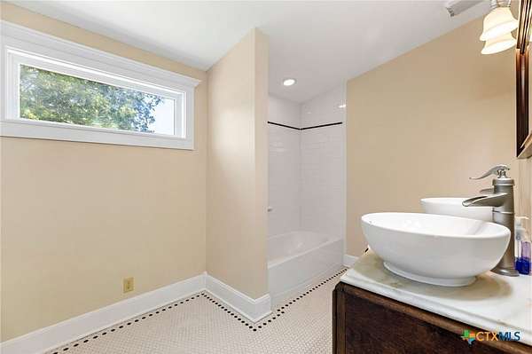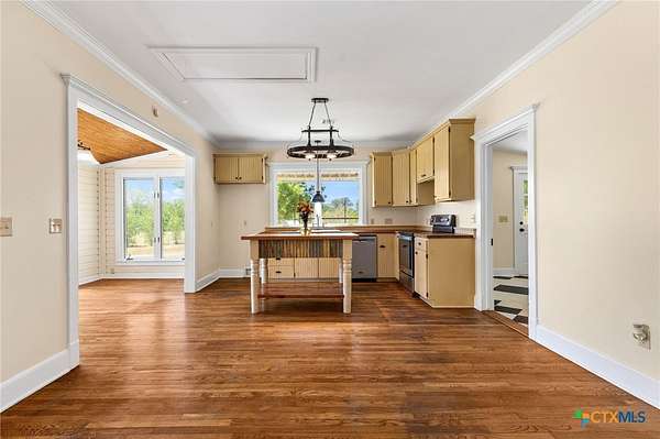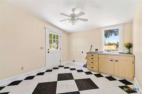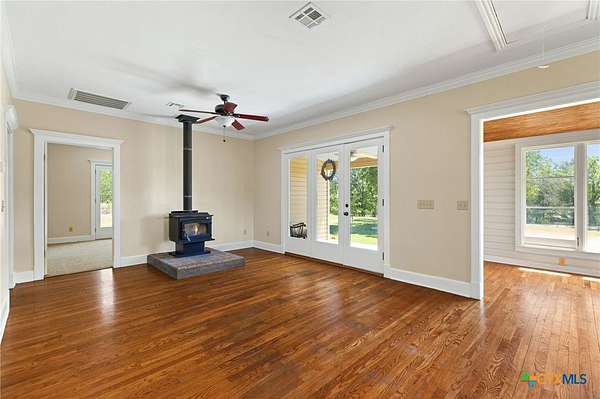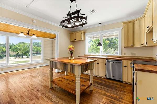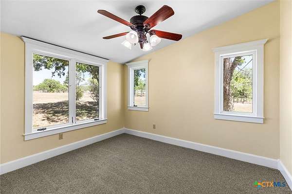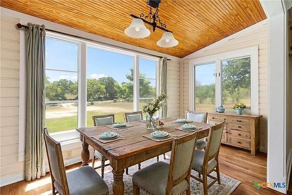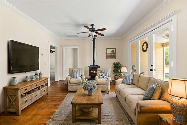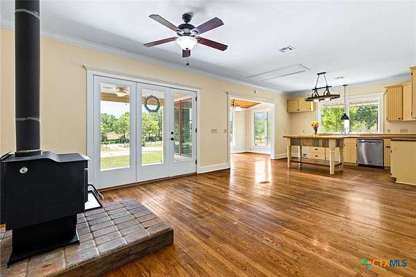 Welcome to your fresh start in the peaceful Texas countryside at this beautifully preserved 1920s ranch-style home for sale in Dale, TX, conveniently located just 30 minutes from Austin. Situated on nearly 10 acres of unrestricted land, this 3-bedroom, 2-bathroom country property offers the perfect blend of historic charm and modern comfort, ideal for those seeking a private rural lifestyle with easy city access. Inside, original hardwood floors, fresh interior paint, and classic black-and-white tile showcase the home's timeless character, while the spacious living room features a freestanding cast iron wood-burning fireplace, high ceilings, and original moldings that reflect true vintage craftsmanship. The open-concept kitchen flows seamlessly into the dining and living areas and includes antique beadboard cabinetry and a striking butcher block island, creating a warm and functional space for everyday living and entertaining. Natural light fills the dining area through charming divided-light windows, enhancing the home's bright and inviting feel. Outdoor living is equally appealing with a welcoming front porch and two additional side porches, including a private porch off the primary suite with French doors and an en suite bathroom featuring an antique vanity. The scenic acreage is dotted with mature oak trees and includes a large tank that retains water even during drought conditions, making it well-suited for livestock, gardening, or recreational use. With approximately 555 feet of road frontage and fully unrestricted land, the property offers outstanding flexibility for building, subdividing, homesteading, or investment opportunities. Additional improvements include a detached barn with covered parking, a spacious storage building, and a chicken coop, making this unique property an exceptional opportunity to enjoy country living with room to grow.