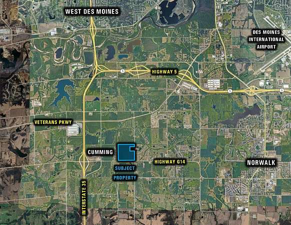 Follow I-35 S to Co. Rd G14/Cumming Ave. Take exit 65 for Cumming Ave. and head east toward Norwalk. Property is located just outside of Cumming on the north side of Co. Rd G14/Cumming Ave and the west side of N 35th St.