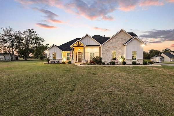 Modern Farmhouse on 2.6 Acres with Shop. Welcome to your dream home! This stunning two-story modern farmhouse blends charm and functionality, featuring stone and siding exterior and set on 2.6 peaceful acres in a quiet country neighborhood. This 4 bedroom, 3.5 bath home features a cozy stone fireplace, dining area, and dedicated office space or game room. The property includes a 2,400 sq. ft. foam-insulated shop with electricity and water line--perfect for hobbies, projects, or storage. Perimeter fencing with gated entrance provides privacy and security. Perimeter Dog Guard fencing is also in place. Enjoy peaceful country living with the convenience of nearby city amenities.