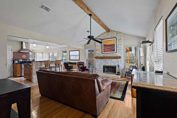 Bathed in natural light & curated with impeccable style, this breathtaking home offers sweeping views that create the perfect backdrop for everyday living. Designed for seamless indoor-outdoor flow, the open-concept layout centers around a striking stone fireplace, creating a warm, inviting atmosphere that opens effortlessly to multiple outdoor entertainment spaces. The kitchen offers endless counter space & large island with seating making hosting a breeze, flowing into a dramatic dining area with soaring ceilings & a picture window frames stunning pool & ranch views. The home was originally designed as a three-bedroom & has been thoughtfully converted to a spacious two-bedroom layout, enhancing the living areas while maintaining comfort & functionality. Two generously sized bedrooms & two full baths provide quiet retreats to end the day. Detached flex space offers excellent versatility & would make an ideal home office, gym, studio, or creative workspace. The courtyard extends across the back of the home, leading to a hot tub, sauna, & fenced pool area--perfect for relaxation & entertaining. Outdoor amenities include a covered RV area with water and a 50-amp hookup & designed to be easily converted into a full-size pickleball court, an impressive six-stall metal barn with wash rack, tack room, electricity, & water, plus a nearby corral with water access. Pastures are fenced & cross-fenced, complemented by a stock tank & mature trees. Currently ag-exempt, this ranch is comfortable, functional & ready for your livestock. Schedule your private tour & watch the sky turn brilliant shades of the night sky over this stunning property. This isn't just a ranch--it's a lifestyle.