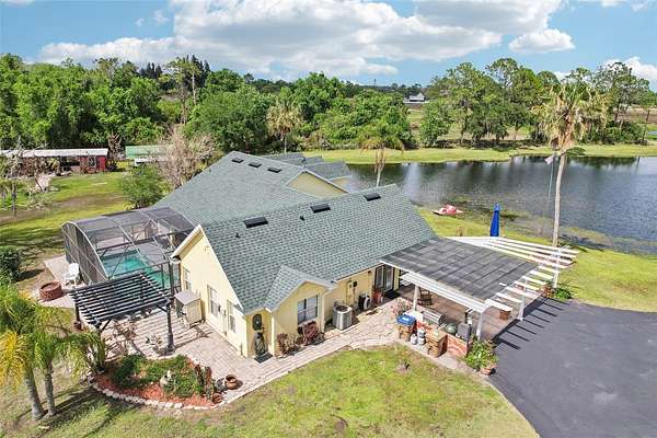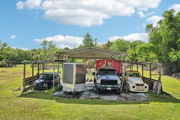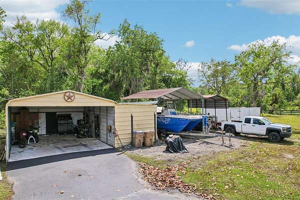 Retreat to the luxurious primary suite, a sanctuary designed for ultimate relaxation with its spacious layout and spa-inspired ensuite bath. While the interior is breathtaking, the outdoor amenities are equally impressive. Step outside to discover your own personal playground with room to roam, garden, or simply enjoy the Florida sunsets. The property features a detached carport and workshop—a dream come true for hobbyists or those needing secure, covered storage for boats, trailers, and RVs.