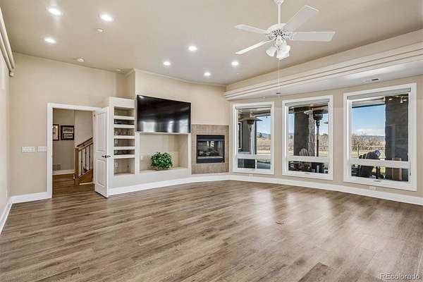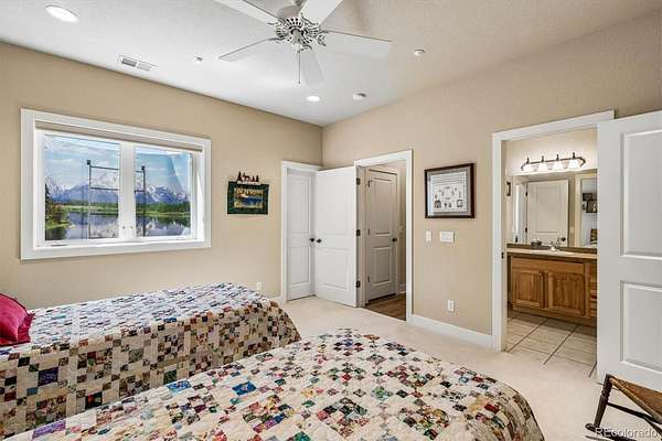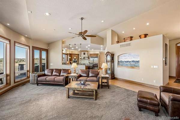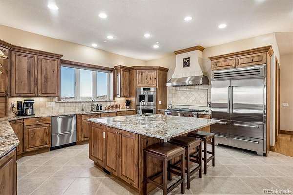 Spanning 6,500+ square feet, this thoughtfully designed home offers an open-concept floor plan filled with natural light and elevated by impeccable craftsmanship and attention to detail throughout. The expansive great room features soaring 13-foot vaulted ceilings, a cozy slate fireplace, custom motorized window shades, and dramatic floor-to-ceiling picture windows that perfectly frame the stunning mountain vistas. The chef’s gourmet kitchen is truly an entertainer’s dream, showcasing slab granite countertops, a huge center island with prep sink, knotty alder cabinetry, and butlers pantry. High-end appliances include a Wolf gas cooktop with 35,000 BTU Wok burner, Monogram double ovens, SubZero refrigerator and under cabinet 35lb capacity ice maker. The luxurious primary suite is a private retreat, complete with its own fireplace, sitting area, built-in cabinetry, coffee bar with sink & fridge, large dual closets, and a spa-inspired five-piece bath featuring dual vanities, free-standing soaking tub, and dual-head shower. The main level is complemented by a formal dining room, private study/office, and a convenient laundry room. The finished walkout lower level provides incredible versatility, featuring a spacious family room with fireplace, full wet bar/kitchenette, three bedrooms, and two additional bathrooms. A bonus craft or flex room or an oversized finished storage space offer endless possibilities, including a potential home theater, game room, or large collection wine cellar. Step outside to the expansive wrap around deck and take in unforgettable Colorado sunsets with family and friends. The oversized four-car garage includes a separate workshop, ideal for hobbies, or just storage. Colorado living at its finest.