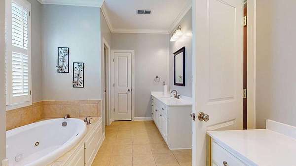 - Crown Moldings, Double Vanities, Garden Tub, Hard Surface Countertops, High, Laundry Room, Light & Airy, Main Level Master Suite, Master Bath, Master Bedroom Walk-In Closet, Open Floorplan, Separate Shower, Sheetrock, Trey, Trey/Box, Vaulted