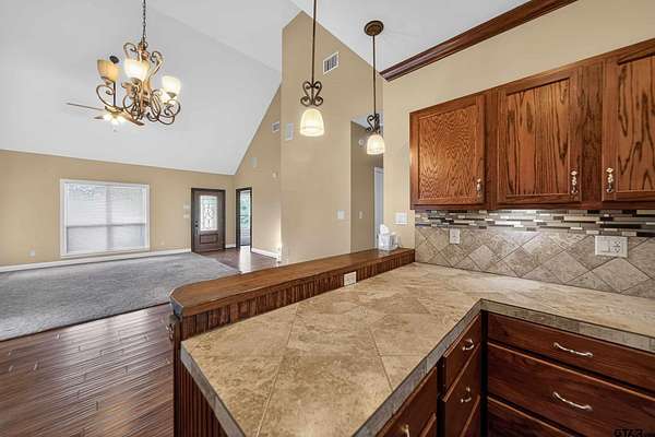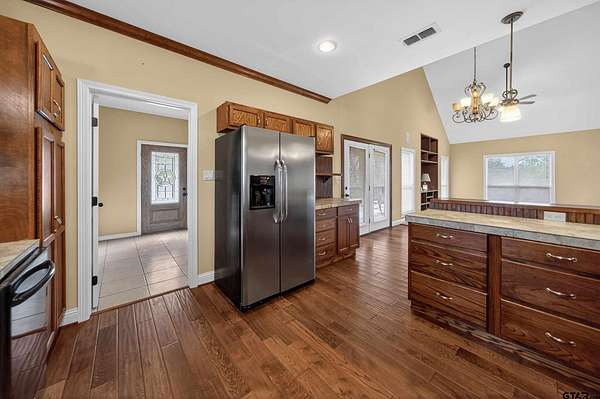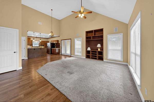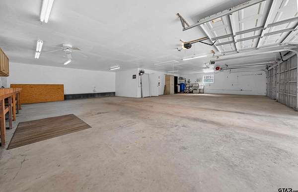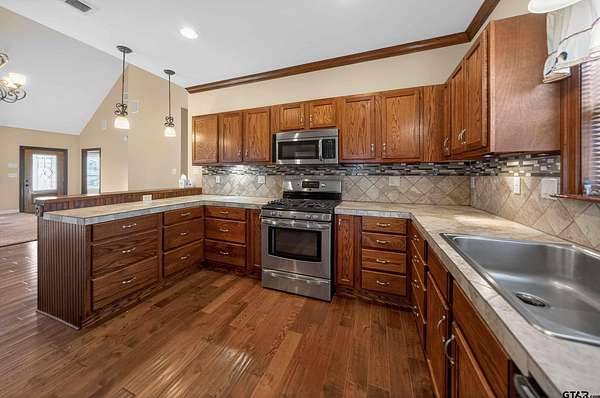 Rural and secluded farmhouse set on nearly 25 acres, offering privacy and wide-open space. This 3-bedroom, 2.5-bath home features beautiful wood flooring and a spacious living area with a cathedral ceiling. The open kitchen includes tile countertops, a gas stove, under-cabinet lighting, and a convenient half bath nearby—perfect for guests. A large laundry room is located just inside the side entry. The split-bedroom layout provides added privacy, with a generous primary suite featuring a massive walk-in shower, double sinks, and a large walk-in closet. Outside, the property is well-equipped with a 4-car garage, full-house generator, sprinkler system, and a pole barn, making it ideal for country living, hobbies, or equipment storage.