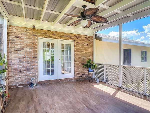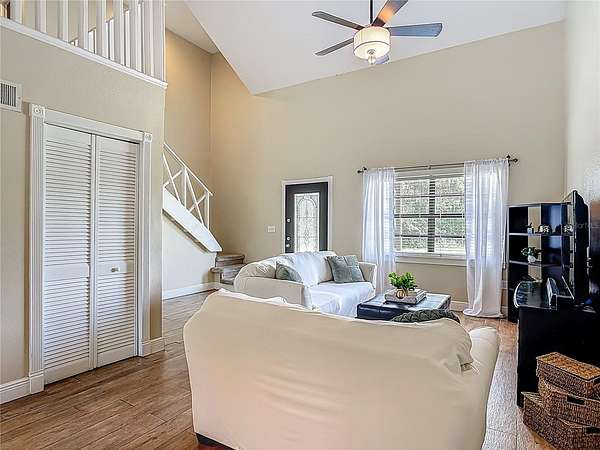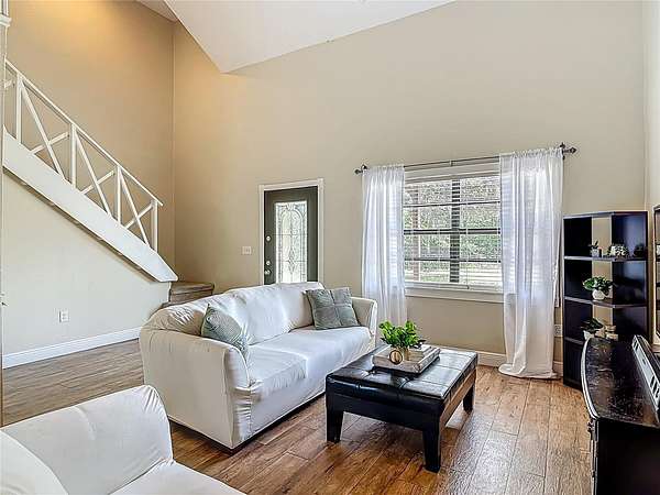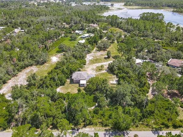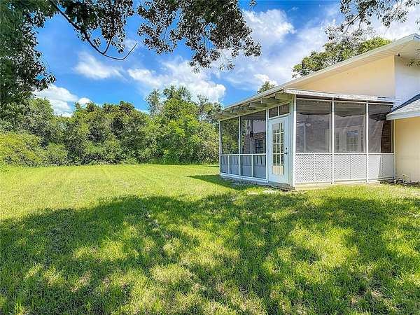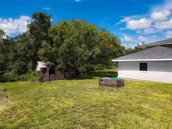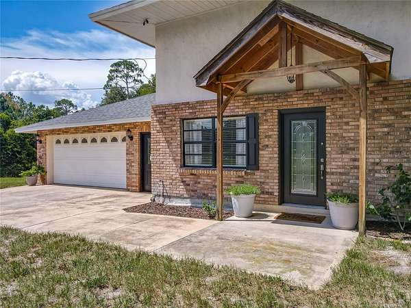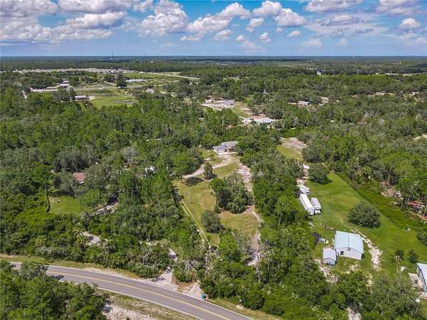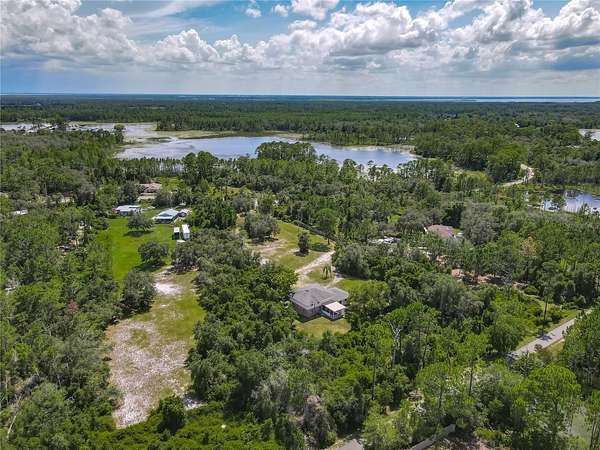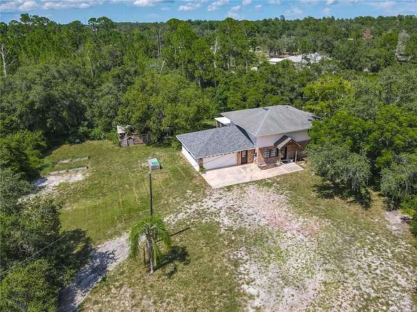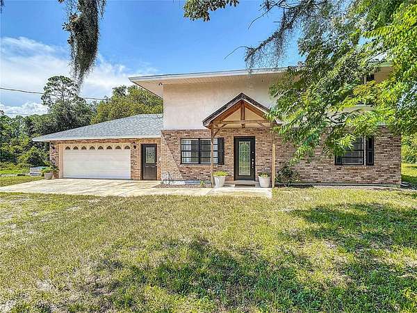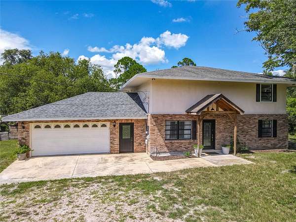 Enjoy some rural serenity on this 3.64 acre homestead that's between a Super Walmart and a new Publix, among others. Open and airy floorplan with soaring living room ceilings. Primary bedroom is upstairs, along with another room to be used as a nursery, office, bedroom, or den. The primary bathroom has access from the bedroom and the hallway and has been beautifully renovated with a large walk-in shower with thick, door-less clear glass and marbled walls with a modern sink/vanity. Two carpeted bedrooms are downstairs. Tiled kitchen is open to the dining area with granite counters, built-in fridge, microwave, smooth-top range/oven, dishwasher, tile backsplash, 42" cabinets, walk-in pantry, and cooking island with Quartz countertop. Enter the spacious screened porch (14x17), with matching laminate flooring and built-in bench seating, from the dining room's double French doors. The oversized garage (24x24), with door opener and plenty of workbench space, is great for hobbies and projects. The existing 24x12 barn/open shed is waiting for your horses or storage. Replumbed with water heater in 2024, garage roof replaced in 2022. The property backs to the paved East Central Florida Trail and the rear fence has a gate to it for your hiking and biking desires! Property qualifies for no money down USDA financing!