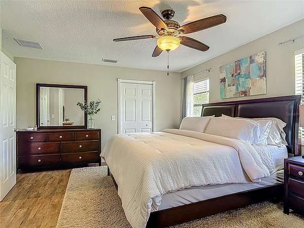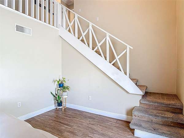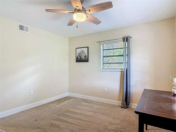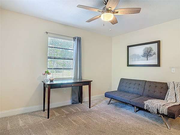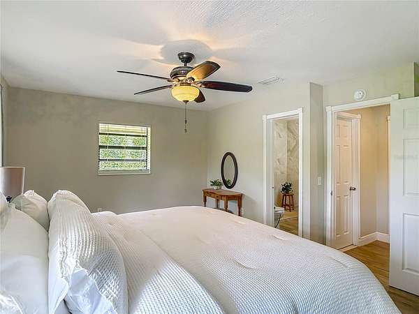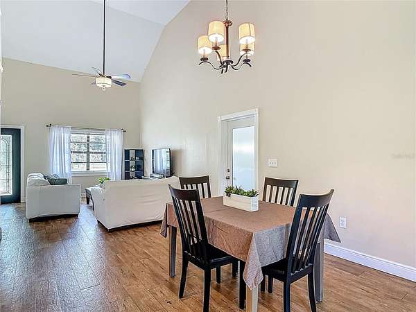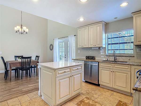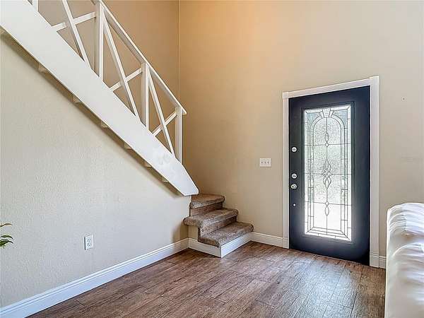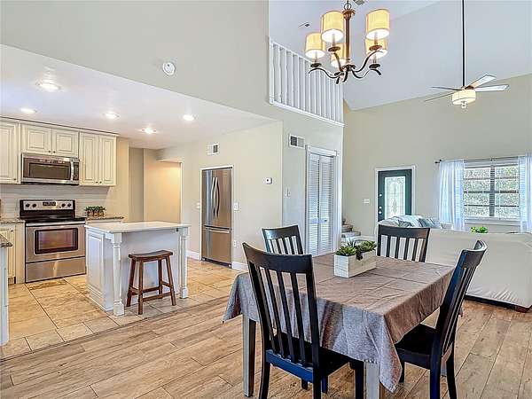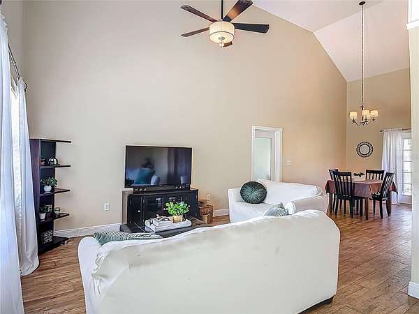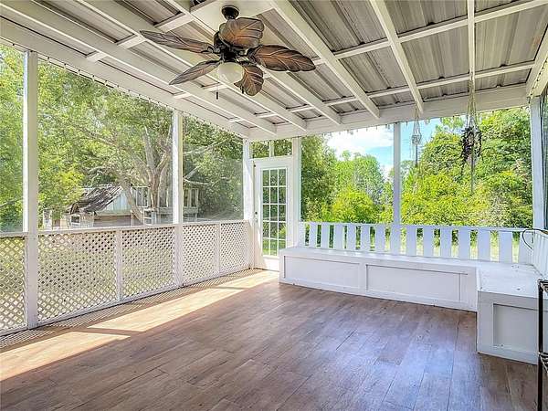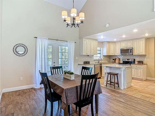 Enjoy some rural serenity on this 3.64 acre homestead that's between a Super Walmart and a new Publix, among others. Open and airy floorplan with soaring living room ceilings. Primary bedroom is upstairs, along with another room to be used as a nursery, office, bedroom, or den. The primary bathroom has access from the bedroom and the hallway and has been beautifully renovated with a large walk-in shower with thick, door-less clear glass and marbled walls with a modern sink/vanity. Two carpeted bedrooms are downstairs. Tiled kitchen is open to the dining area with granite counters, built-in fridge, microwave, smooth-top range/oven, dishwasher, tile backsplash, 42" cabinets, walk-in pantry, and cooking island with Quartz countertop. Enter the spacious screened porch (14x17), with matching laminate flooring and built-in bench seating, from the dining room's double French doors. The oversized garage (24x24), with door opener and plenty of workbench space, is great for hobbies and projects. The existing 24x12 barn/open shed is waiting for your horses or storage. Replumbed with water heater in 2024, garage roof replaced in 2022. The property backs to the paved East Central Florida Trail and the rear fence has a gate to it for your hiking and biking desires! Property qualifies for no money down USDA financing!