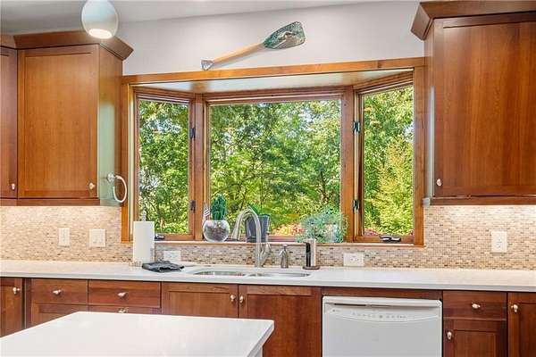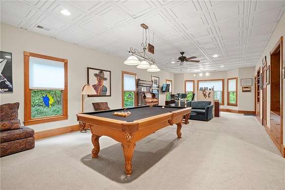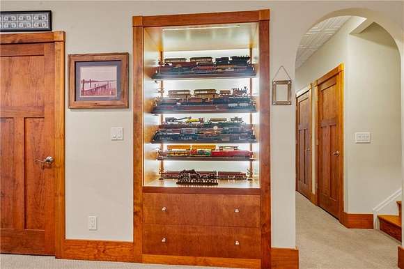 Heated tile flooring on both Main-Level Baths; all showers and countertops are custom-made Corian; elaborate sound-system throughout.....MAIN LEVEL: Light, open, Eat-In Kitchen has abundant workspace, custom cabinetry, large-drawer storage, and two Pantries - and new countertops added in Aug 2025.....Great Room features include vaulted, tongue-and-groove (no-knot) pine ceiling, stunning floor-to-ceiling stacked-stone fireplace, and stained custom built-in cabinetry.....Open-concept Dining Area comfortably seats 10+.....A spacious vaulted-ceiling Sun Room, with ceramic tile flooring, dedicated HVAC system, sliding glass and screen panels with remote-controlled motorized Gerber roller shades, and easy exterior access to Decks) offers room for entertaining or just relaxing - with serene views....Two Bedrooms on the Main Level: Oversized Master Suite is private yet convenient, with tray ceiling, walk-In Closets, private access to Deck; 2nd Bedroom is well-sized, with adjoining Full Bath with private and Guest access.......TERRACE LEVEL: Access via elevator or convenient, gentle stairway, with same high-end quality and craftsmanship as Main Level.....Huge Family Rec Room with large windows on two walls, beautiful built-ins, and access to exterior; two well-sized Bedrooms with Full Baths; abundant storage room.........Two-level Workshop (Check out the photos)!........Absolutely must see to appreciate!