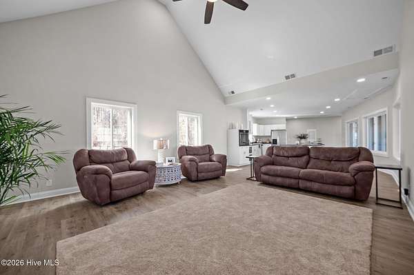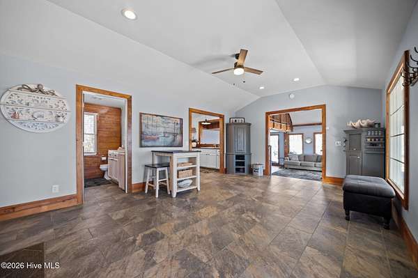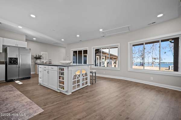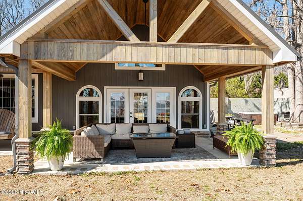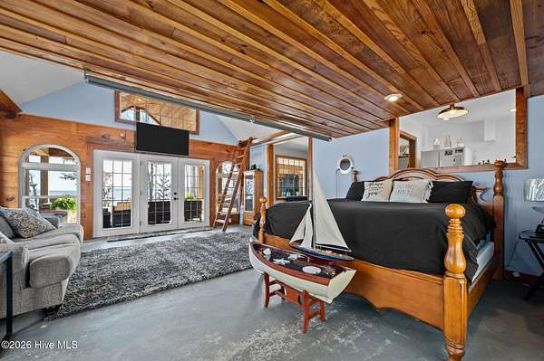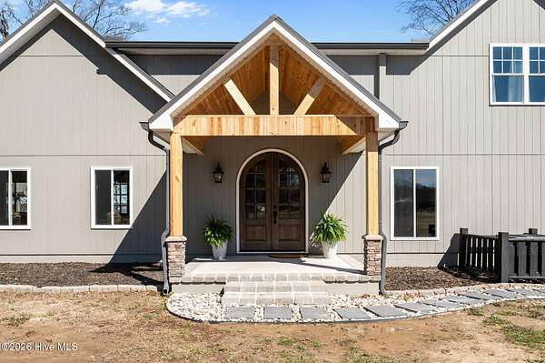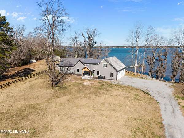 Welcome to waterfront living at its finest on the stunning Pamlico River where breathtaking views stretch endlessly across the water from nearly every room. The private primary wing is truly its own retreat featuring direct access to the open covered porch overlooking the Pamlico Sound, a private living space, kitchenette, full bathroom and spacious walk-in closet. Wake up each morning looking straight over the water---serenity at its best. Expansive covered porches line the riverside of the home, offering incredible outdoor entertaining space and peaceful sunset views. Enjoy meals framed by sparkling water vista and the kitchen that is built for gathering. It includes a large center island, pantry, stainless steel sink, and a wall of windows bringing natural light in. The inviting living room has cathedral ceilings, an elegant entry door, cozy electric fireplace, open foyer and conveniently located powder room with washer and dryer. The upstairs living includes three bedrooms with water views and a full bath featuring tiled shower, jacuzzi tub and built in bench. This property is situated on a high 1.96 acre lot with 230 feet of sandy shoreline, concrete pier, boat lift and direct access to boating, fishing and waterfront fun. If you've been searching for endless views of the Pamlico River, expansive porches and space to truly live the coastal lifestyle, look no further, this is it!!!!
