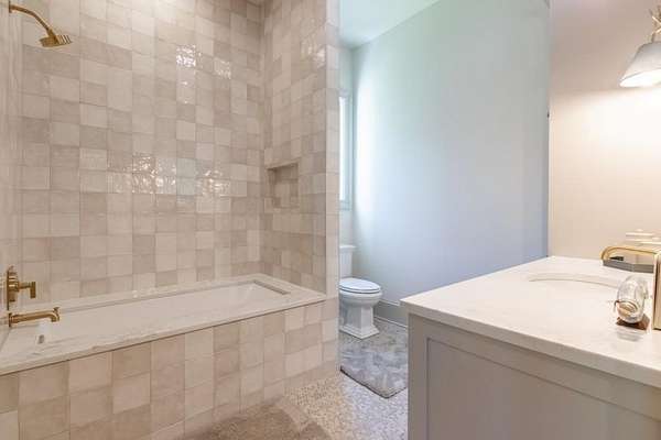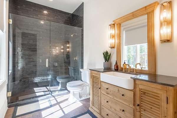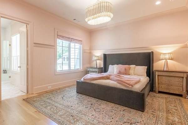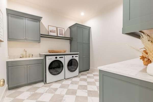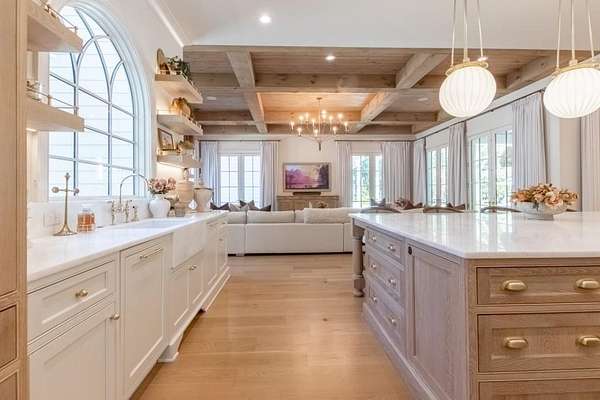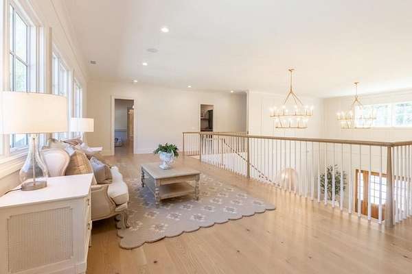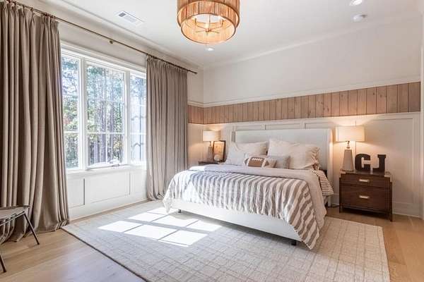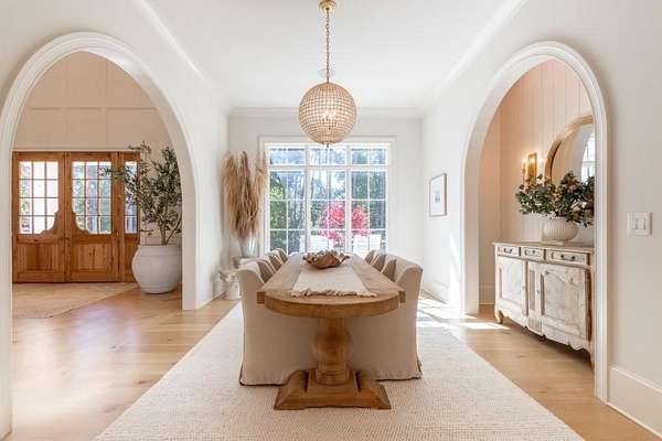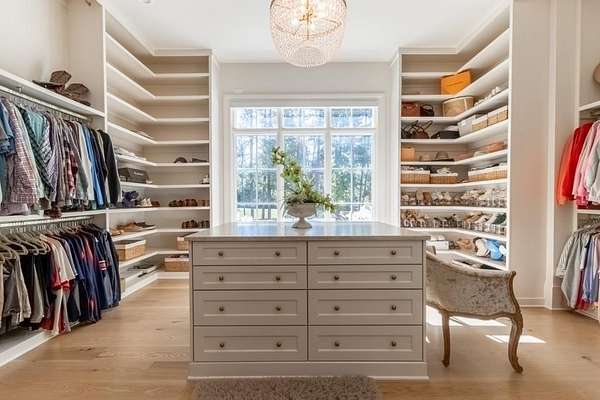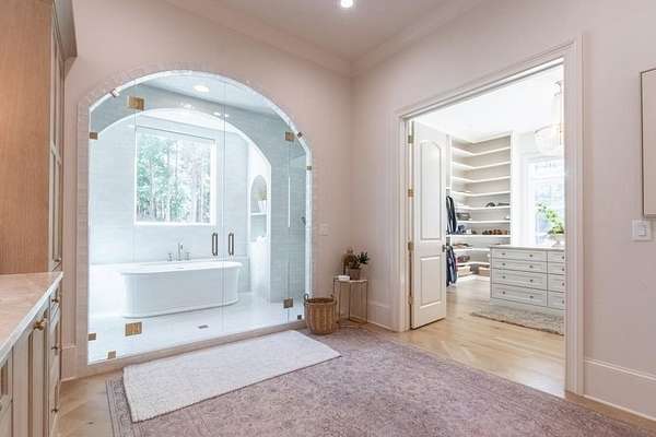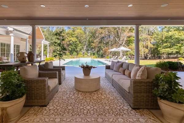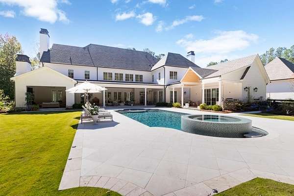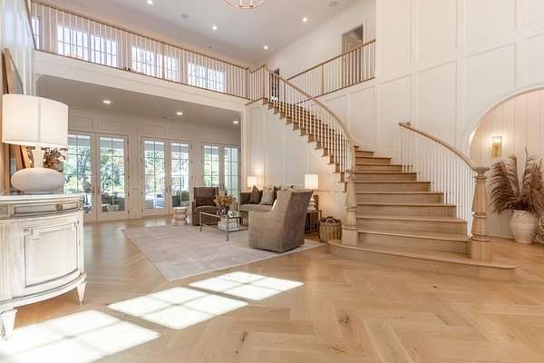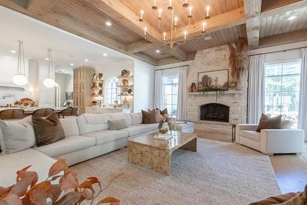 Set behind a private gated entry with gas lanterns, this extraordinary 6-bedroom, 6.5-bath estate showcases timeless stone and brick architecture on 3 pristine acres, offering over 9,000 square feet of refined living space. Designed with uncompromising attention to detail, the home blends classic craftsmanship with modern luxury. A custom antique white oak front door opens to a breathtaking grand foyer with soaring 25-foot ceilings and a dramatic curved staircase. Large aluminum-clad windows and French doors flood the home with natural light, highlighting elegant arched doorways, engineered wide-plank white oak floors, fluted custom doors, and exceptional millwork throughout. The expansive family room features 12-foot tongue-and-groove ceilings with exposed beams and is anchored by an impressive Indiana limestone fireplace. The chef's kitchen is a true showpiece, boasting custom inset white oak cabinetry, marble countertops, oversized center island with garden sink and a full suite of Sub-Zero and Wolf appliances. A fully equipped scullery includes a steam oven, standard oven, warming drawer, second dishwasher and abundant storage ideal for seamless entertaining. Adjacent, the formal dining room offers a wet bar and wine display set against a striking stone feature wall. The private owner's suite on the main level is a tranquil retreat with a gas fireplace, separate sitting area, and serene wooded views. The spa-inspired bath features dual vanities, an arched frameless glass shower with dual shower heads, designer tile niches and a massive custom closet with center island, shoe display, handbag display and stacked washer/dryer with steam closet. One of a kind task room/laundry room on main. The secondary level includes four spacious en-suite bedrooms, a dedicated study, an oversized recreation room and convenient laundry facilities. Resort-style outdoor living defines this estate, with over 1,600 square feet of covered porch space, including a vaulted outdoor living area finished in Indiana tumbled limestone with automatic screens. The outdoor kitchen features a Wolf grill and side burner with Sub-Zero refrigeration, overlooking a stunning 20x48 saltwater pebble pool with infinity-edge raised spa. A pool house with full wet bar and full bath completes the experience. Additional highlights include home surveillance, extensive exterior lighting, epoxy-floored garages with a dog wash station, and 1,600 square feet of garage storage space, stubbed and ready for future expansion. High-end lighting from Visual Comfort and Rejuvenation enhances the home throughout. This one-of-a-kind estate offers privacy, sophistication, and resort-level amenities an exceptional opportunity for luxury living.
