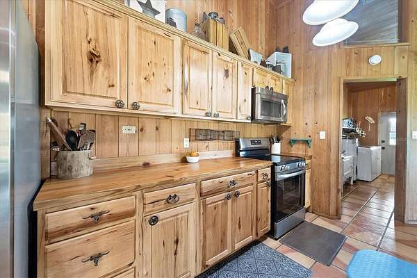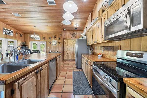 The 4-bedroom, 2.5-bathroom home boasts an inviting layout, perfect for family living or entertaining. Natural light floods the interior, highlighting the warm Saltillo style tile floors, cozy living areas, and an open kitchen ideal for preparing meals with a view of the sprawling landscape. An ensuite and additional bedroom and bathroom were recently added within the last two years. The addition has wood grained waterproof vinyl floors and wood-stained trim throughout. A newly constructed wrap around porch with metal roof was installed in March 2025.