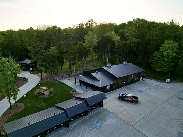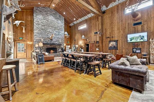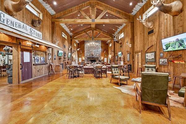The estate features approximately 7,000 SF of lodge and pro shop space, a 5,000 SF event center with commercial kitchen, and a 3,000 SF covered patio with outdoor pizza oven. Championship-level sporting infrastructure includes three 16-station courses, two 40-foot elevated towers, covered 5-stand fields, and 146 MEC automated target systems meeting NSCA standards. Additional amenities include a one-bedroom suite and dedicated bride and groom preparation suites.