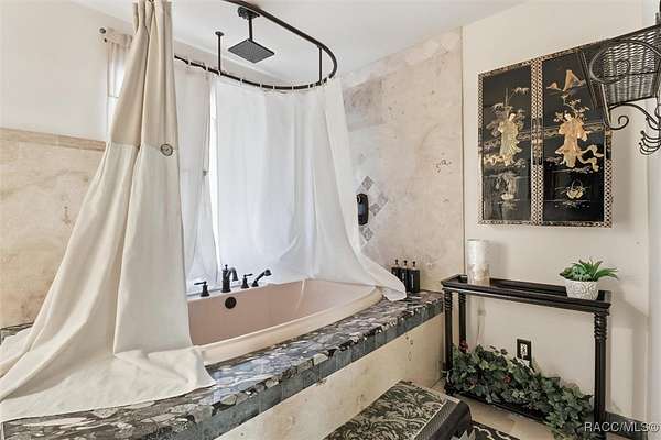 - Beamed Ceilings, Fireplace, First Floor Entry, French Doors Atrium Doors, Garden Tub Roman Tub, High Ceilings, Main Level Primary, Open Floorplan, Sitting Area In Primary, Stone Counters, Tub Shower, Vaulted Ceilings, Walk In Closets, Window Treatments, Wood Cabinets