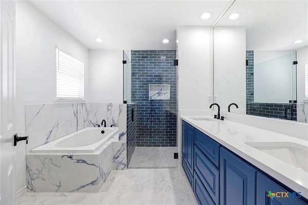 - All Bedrooms Down, Attic, Beamed Ceilings, Breakfast Area, Breakfast Bar, Built In Features, Ceiling Fans, Custom Cabinets, Double Vanity, Eat In Kitchen, Entrance Foyer, Garden Tub Roman Tub, High Ceilings, Living Dining Room, Main Level Primary, Open Floorplan, Primary Downstairs, Pull Down Attic Stairs, Separate Shower, Shower Only, Walk In Closets