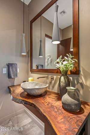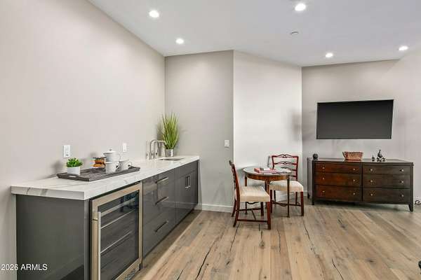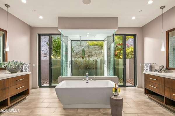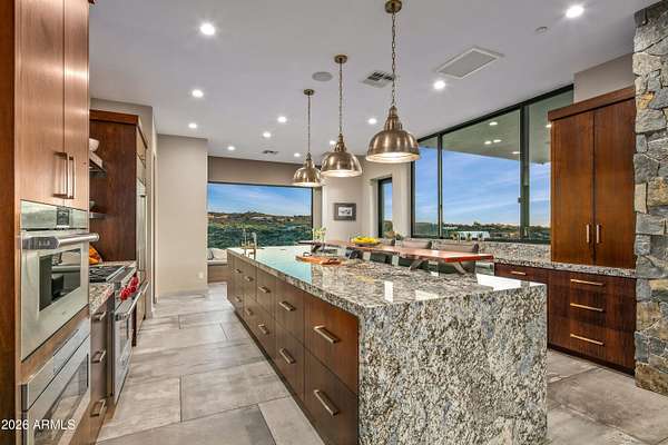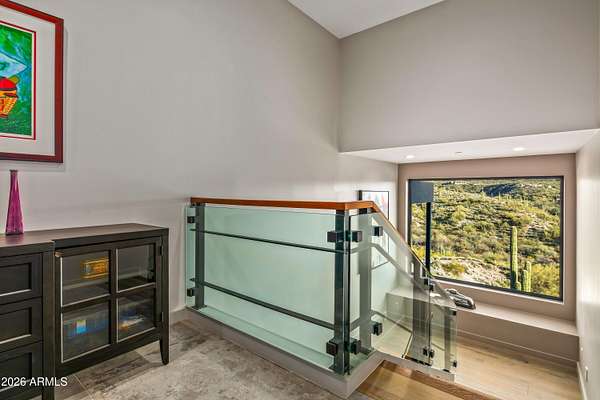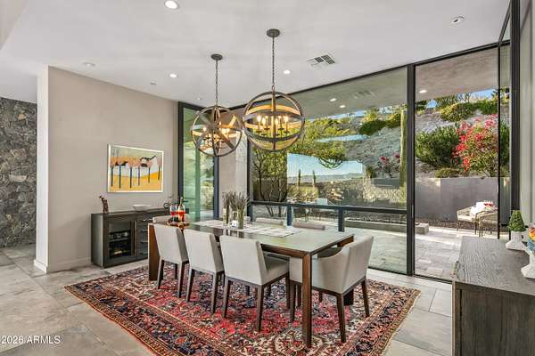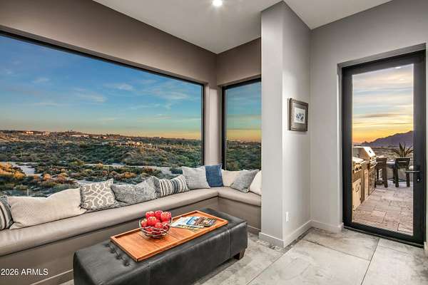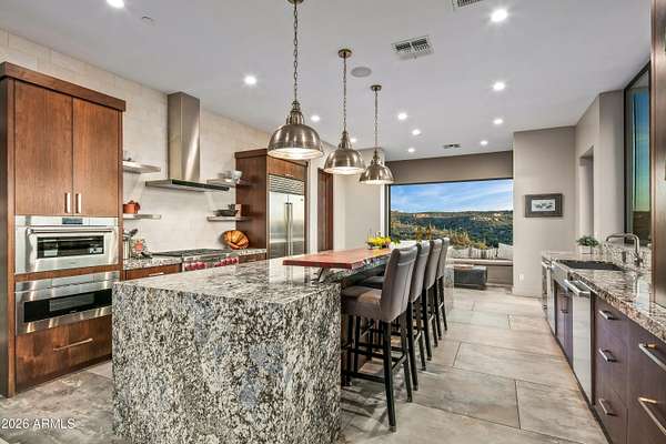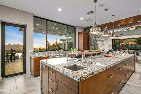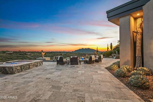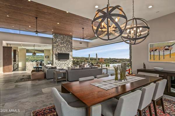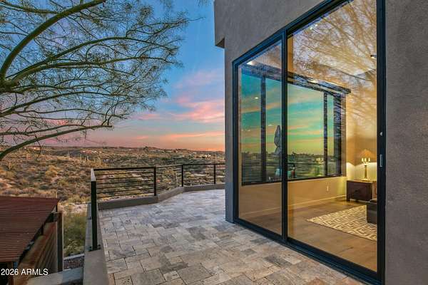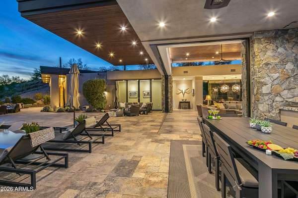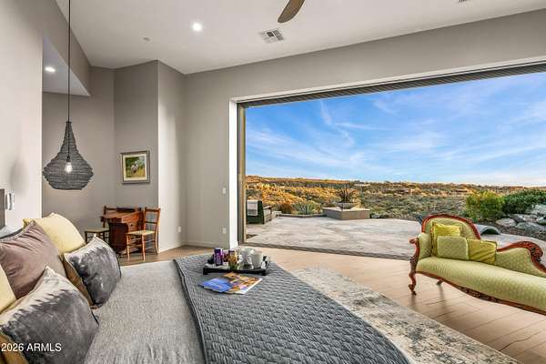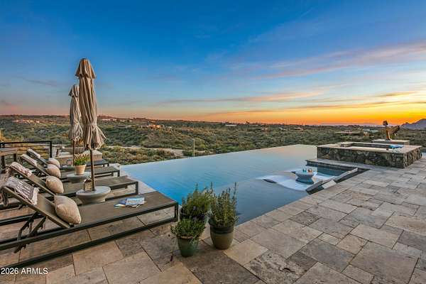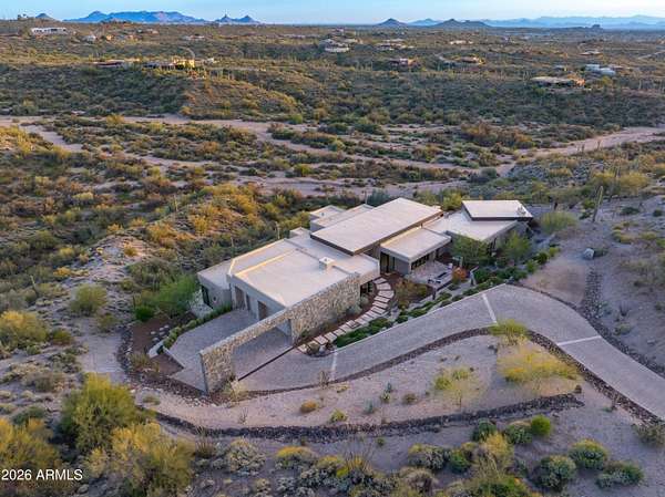 Perched majestically on a sprawling 10-acre hillside estate, this 2020 contemporary marvel offers an unparalleled lifestyle defined by architectural brilliance and the raw beauty of the Sonoran Desert. With sweeping views of shimmering city lights, rugged mountain peaks, and Arizona's legendary sunsets, this is more than a home it's a private sanctuary. Architectural Artistry & Design Every inch of this residence reflects meticulous craftsmanship and immaculate care. The interior is a symphony of glass and wood, featuring: Soaring Tongue-and-Groove Ceilings: Adding warmth and volume to the sleek contemporary lines. Walls of Glass: Disappearing boundaries that invite the desert landscape into every room. Gourmet Epicurean Kitchen: A chefs dream featuring a social island with a live-edge wood and granite stone finish, top-tier appliances, and an expansive back pantry. Entertainers Dream: A full-service wet bar and a dedicated view nook make hosting as effortless as it is elegant. Versatile Luxury & Rare Opportunity This estate offers rare flexibility for the discerning investor or homeowner: Development Potential: The pristine 10+ acre lot can be split into two 5-acre parcels, providing a unique opportunity for future expansion or investment. The Casita Suite: One of the four bedrooms is a fully equipped casita, boasting a kitchenette, wine cooler, and a private, expansive sunset patio perfect for multi-generational living or elite guest hosting. Expansion Ready: The oversized 3-car garage is already pre-plumbed and wired for an additional casita or studio. An Outdoor Oasis Designed for the ultimate al fresco lifestyle, the grand patio and exterior grounds rival the world's finest resorts: Infinity-Edge Pool & Waterfall Spa: Seamlessly blending into the horizon. Fire Features: Strategically placed to enhance the ambiance of the starlit desert sky. Multiple View Patios: Whether dining al fresco or lounging by the fire, every vantage point offers a new perspective on Carefree's natural splendor. Property Highlight: This estate represents a rare fusion of 2020 (Certificate of Occupancy) modern construction and "Old Arizona" acreage, offering privacy that is increasingly difficult to find in the luxury market.
