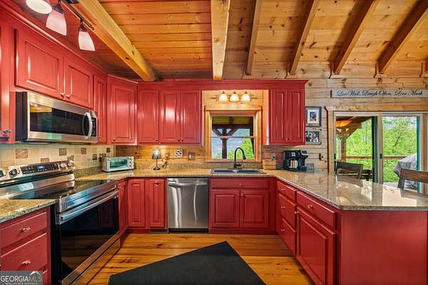Welcome to MORVIEW, a fully furnished, meticulously maintained 3-bedroom, 3-bath log cabin with a hot tub that offers year-round, unobstructed mountain views from one of the most desirable lots in Trahlyta Estates. Whether you're seeking a peaceful second home, a private mountain getaway, or a high-performing short-term rental, this property checks every box. Located in the scenic heart of Dahlonega, just minutes from North Georgia's top-rated wineries and outdoor attractions, this home strikes the perfect balance between rustic charm and modern comfort. The spacious main-level primary suite opens to a screened porch with low-maintenance Trex decking, providing the ideal spot for morning coffee or evening relaxation while taking in the sunrise over the mountains. Enjoy over 1,100 square feet of brand-new wraparound decking-60% Trex on the upper level and 40% pressure-treated wood on the lower-designed to enhance outdoor living and take full advantage of the sweeping eastern mountain views. On the lower level, unwind in the private hot tub area, complete with an outdoor shower, offering a spa-like retreat right at home. The updated kitchen features granite countertops, stainless steel appliances, and custom-painted cabinetry, while all three bathrooms showcase wood cabinetry and granite finishes. The main-level suite boasts stunning views, abundant natural light, and an oversized walk-in shower. Offered fully furnished, including the hot tub, MORVIEW is truly move-in ready-or ready to start generating rental income from day one. Short-term rentals are permitted in this quiet, well-maintained community, providing flexibility and potential ROI. Recently re-stained and carefully cared for, this property is more than just a mountain home-it's a lifestyle investment. Don't miss your chance to own a rare mountain retreat in one of Dahlonega's most sought-after neighborhoods, just a short drive north of downtown.