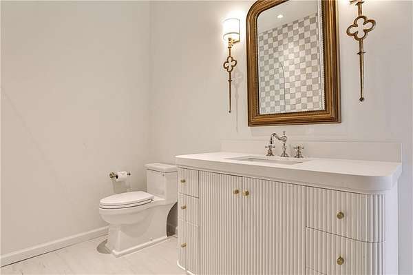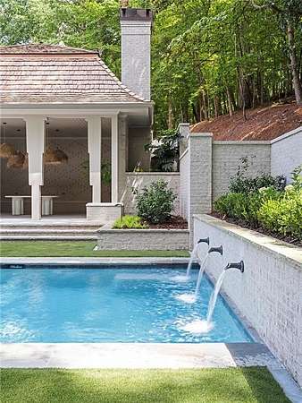 Features include a French-inspired chef's kitchen with LaCanche range, limestone fireplace, fluted living room opening to the walk-out pool and cabana, and a primary wing with spectacular closets and a Viola marble spa bath. Upstairs holds four ensuite bedrooms; the terrace level offers a lounge, gym with infrared sauna, guest suite, and a secret "Speak Easy" wine cellar with hidden hydraulic staircase to the family room. Minutes to Lovett, Westminster, Buckhead shopping and dining.