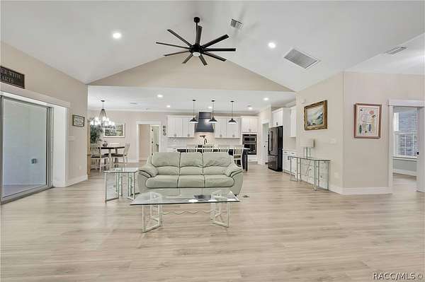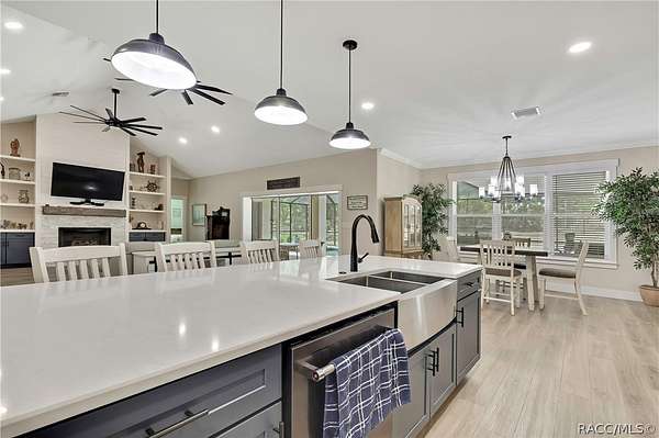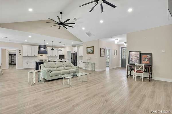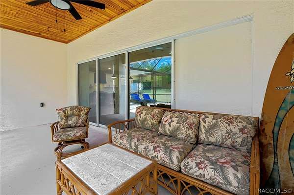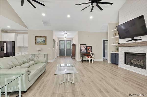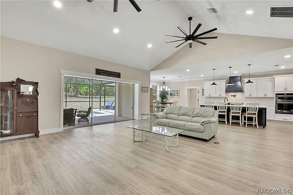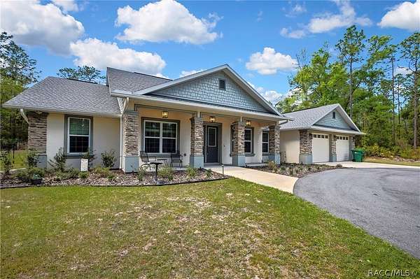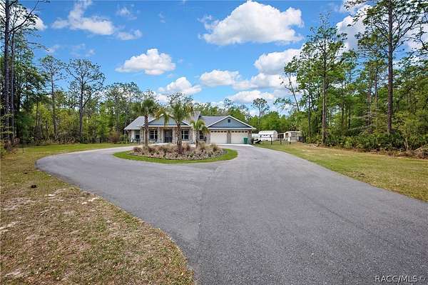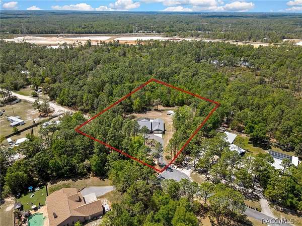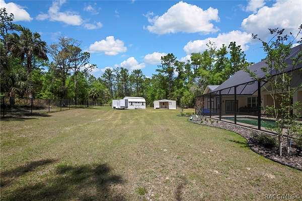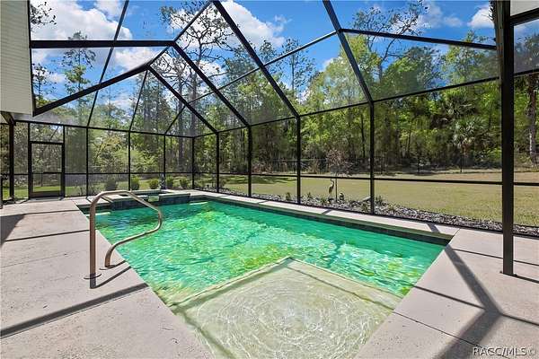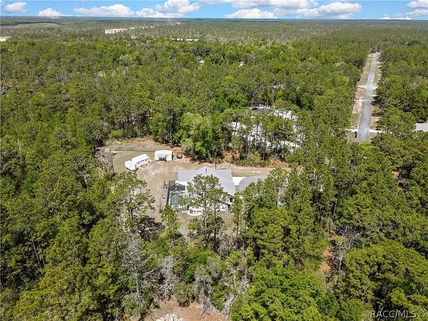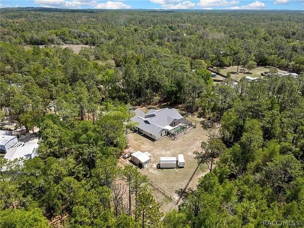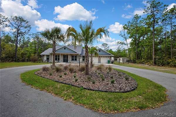 PRIVATE CUL-DE-SAC ESTATE ON 3.07 ACRES IN PINE RIDGE | Resort Pool + Designer Finishes Experience refined country luxury in this exceptional custom estate at the end of a quiet cul-de-sac in the sought-after Pine Ridge community. Set on 3.07 private acres of mature trees, this stunning home offers over 4,100 sq. ft. under roof, blending elegance and modern functionality-a true nature-lover's dream. A circular paved driveway centered around a landscaped garden creates a striking first impression. The property is prewired for a future electric gate and features professional landscaping leading to double garage doors. Inside, an open-concept design with 4 bedrooms, 4 bathrooms, and a versatile office features designer finishes and vaulted ceilings. The main living area is anchored by a gas fireplace with modern white brick, wainscoting, and custom built-in cabinetry with towering bookshelves. The chef's kitchen is the heart of the home, showcasing custom cabinetry, an oversized island, high-end black stainless appliances, and a gas cooktop with a custom hood. A large walk-in pantry includes a convenient "grocery door" leading directly to the garage for effortless unloading. The primary suite is a true retreat, featuring barn door entry to a spa-inspired bath with a glass-enclosed rainfall shower, jetted soaking tub, and dual vanities. The expansive walk-in closet connects directly to a well-appointed laundry room with an LG tower washer/dryer and utility sink. Thoughtfully designed for flexibility, the home includes a private guest/mother-in-law suite with its own walk-in closet and attached bath. A secondary flex space near the primary wing serves as an ideal mudroom or hobby space with its own garage access. Efficiency meets comfort with a tankless water heater, 250-gallon underground propane tank, and two A/C systems. The extra-long custom garage accommodates full-size pickup trucks on both sides and offers direct access to the fenced yard. Step outside to a resort-style oasis featuring a heated saltwater pool and spa within a screened enclosure. An extended patio roof creates a massive covered outdoor living area, complete with a pool-side bathroom and dedicated outdoor shower. Approximately 1/2 acre is fully fenced for pets, while the remaining 2.57 acres offer peaceful wooded surroundings frequent with native wildlife. Two outbuildings with underground electric provide flexibility for storage or a workshop. Located in Pine Ridge, Citrus County's premier equestrian community, residents enjoy miles of riding trails and a community equestrian complex. This property offers the space, privacy, and upscale finishes luxury buyers demand, while remaining close to shopping, dining, and the Nature Coast's best boating and golf. This isn't just a home-it's a sanctuary.