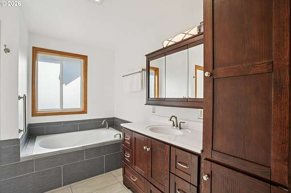 - Ceiling Fan, Garage Door Opener, High Ceilings, Laminate Flooring, Soaking Tub, Tile Floor, Vaulted Ceiling