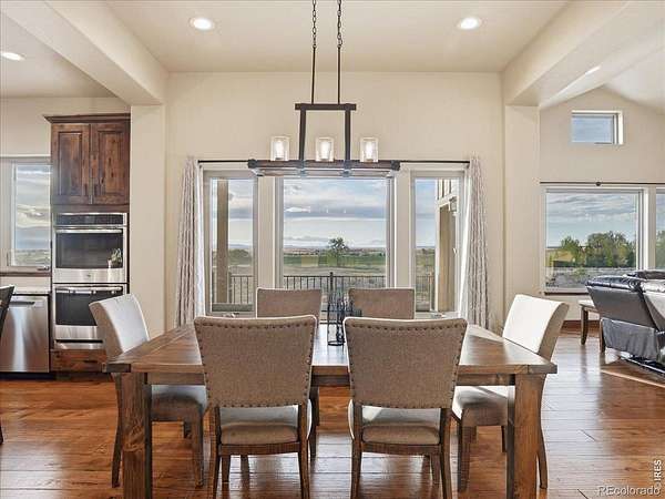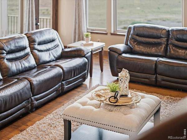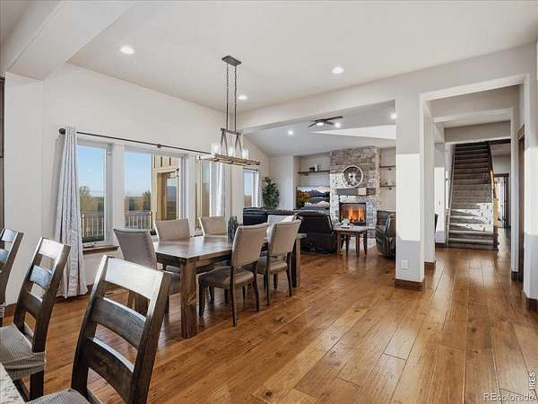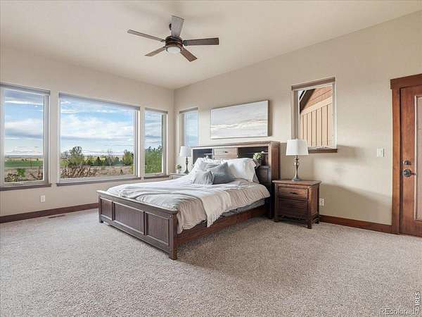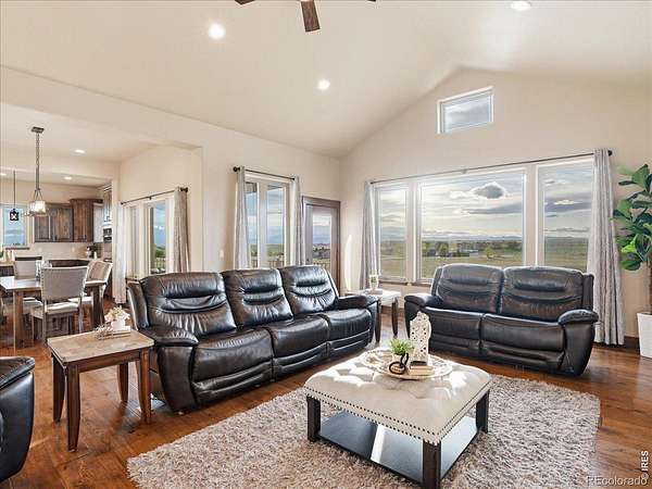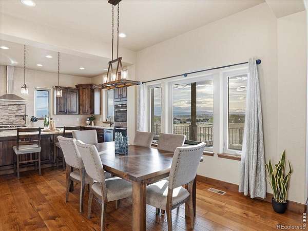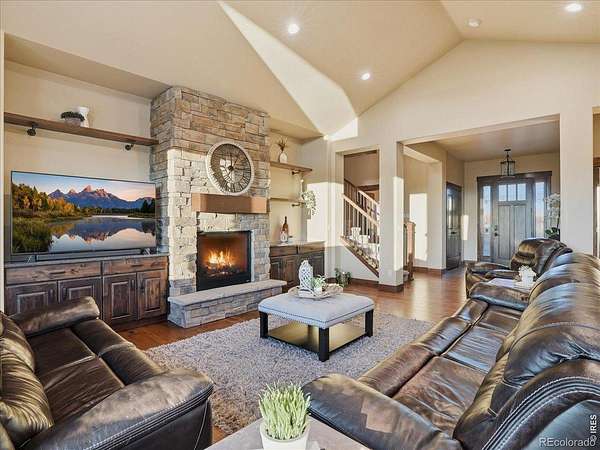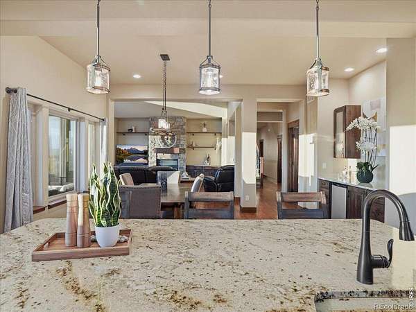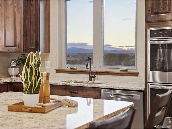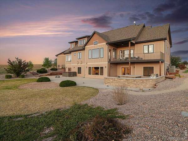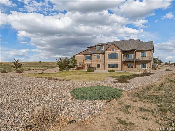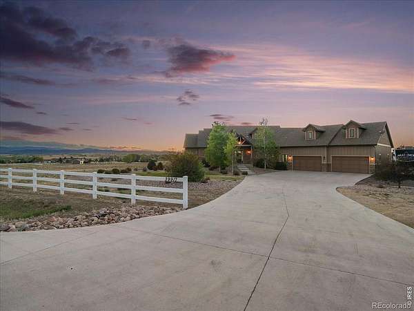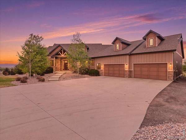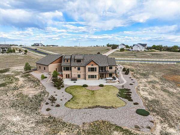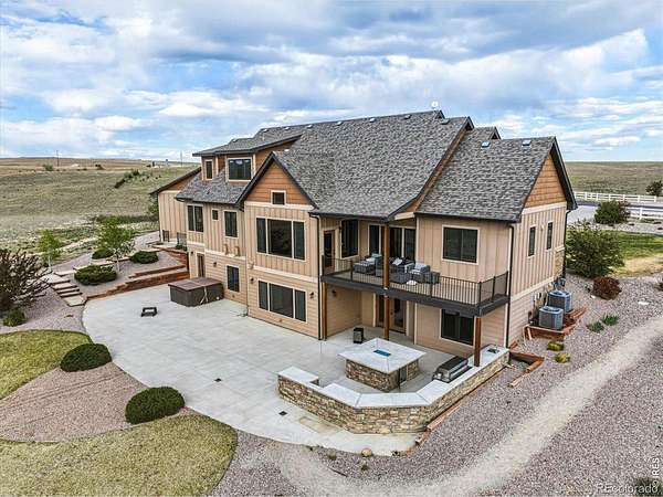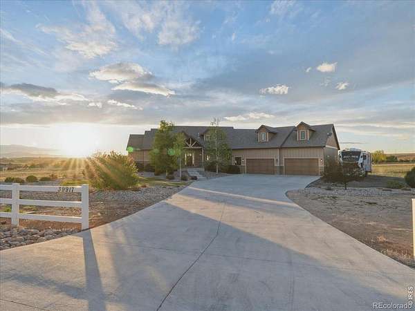 Belmont Farms - 5.66 acres - mountain views - walkout basement - 8-car garage - 6 baths - covered deck - hot tub- Set on 5.66 acres in Belmont Farms, 39917 Hilltop Circle pairs luxury finishes with open land, panoramic mountain views, and exceptional garage space. The setting is a standout, with the best views captured from the covered deck, lower patio, and from inside of the home, creating a true Colorado backdrop for daily living and outdoor entertaining. Inside blends luxury and comfort with a main-floor primary suite, dedicated study, open-concept kitchen, dining, and living spaces, plus an upper level with two additional bedrooms, full bathroom, and a loft. The kitchen is designed for both function and style with a large island, gorgeous slab countertops, custom cabinetry, gas cooktop, double wall ovens, pot filler, and picture windows that bring the landscape inside. Wood floors, solid wood doors, and a floor-to-ceiling stone fireplace add depth and character throughout the main level. The walkout basement expands the living space with two more bedrooms, a family room, rec room, kitchenette, sitting area, and substantial unfinished storage, offering flexibility for guests, hobbies, or multi-use living. Outdoor spaces are equally impressive, with a covered deck, expansive patio, included firepit, built-in grill, and hot tub, all positioned to enjoy the wide-open surroundings and Front Range views. One of the most distinctive features is the oversized 8-car garage with its own half bath, giving this property rare capacity for vehicles, recreational equipment, workshop use, or additional storage. Enjoy Luxury inside and acreage outside, with views from everywhere! You can also add an additional shop if you need more work space. Campers are allowed to park by the home. Bring your Toys!
