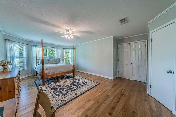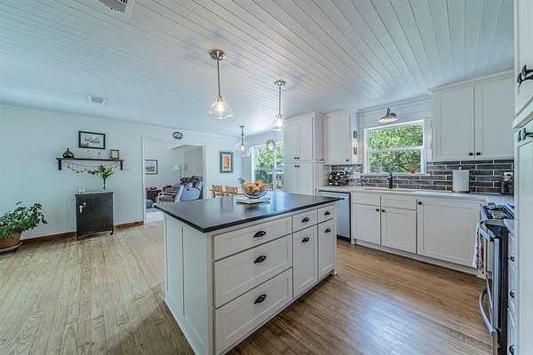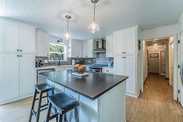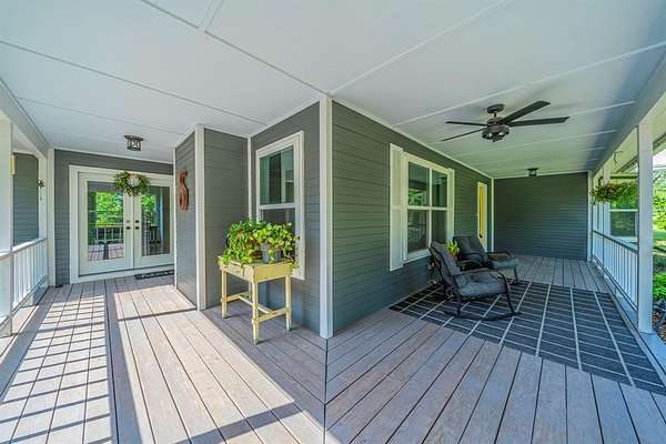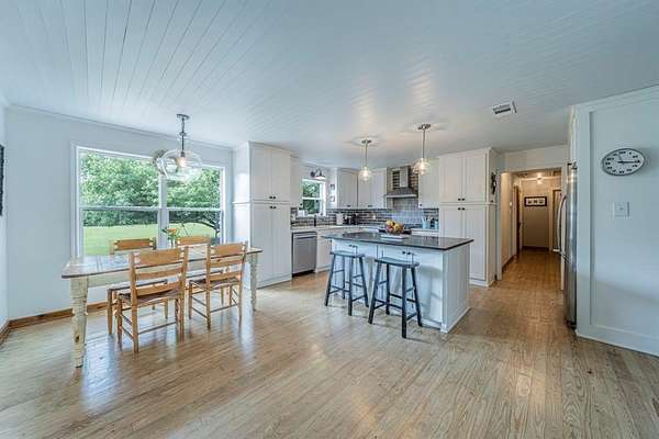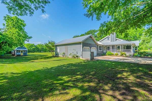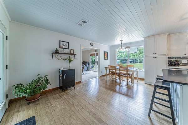 Charm abounds on this 1.71-acre property with immaculate single-story home, workshop with electricity, & greenhouse! A wrap-around front porch and re-finished pine floors grace this home, which features two living areas, a wonderful updated kitchen with island, a large dining area, 3 bedrooms, 2 full bathrooms, and even a 22x10 exercise room with its own AC system (not included in total square footage). Kitchen includes 5-burner gas range, farm sink, dishwasher, & SS appliances. The primary bedroom is large enough for a sitting area, and a sliding barn door leads to the primary bath with 2 sinks and tub-shower combination. The spacious front living room flows seamlessly into the dining area and kitchen - ideal for entertaining or large gatherings. The original breezeway has been enclosed to provide a second living area with built-in bookcases and window seat. Everywhere you look will feel like home! An expansive open back patio, a large workshop with electricity, a greenhouse, and raised garden beds enhance the complete livability of this property, Country living and a few short miles from all the amenities you need. Come see it!