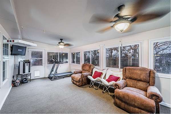 - Concrete Walks, Covered Front Porch, Exterior Lights, Mature Trees, Out Building, Storage Shed, Sun Room