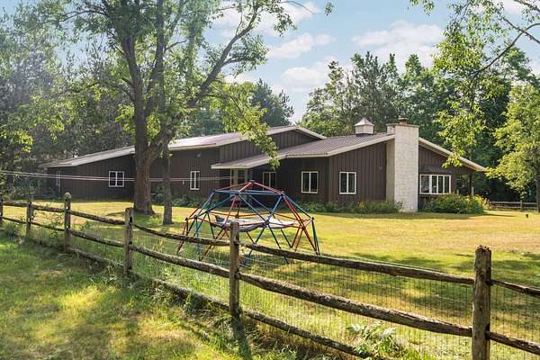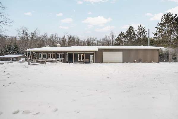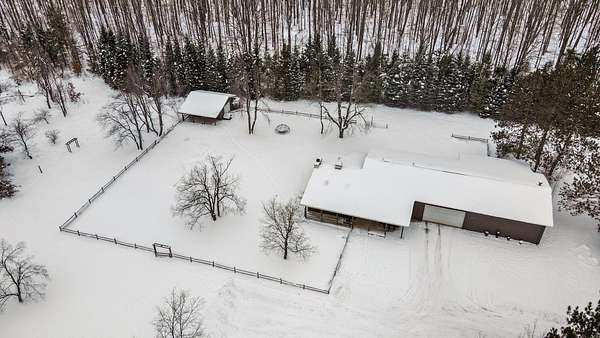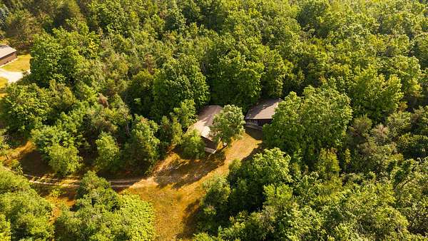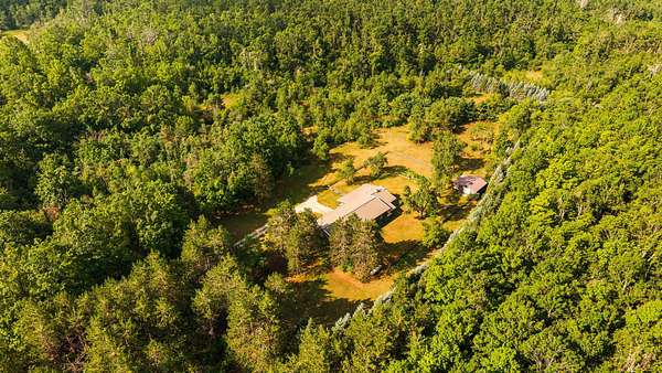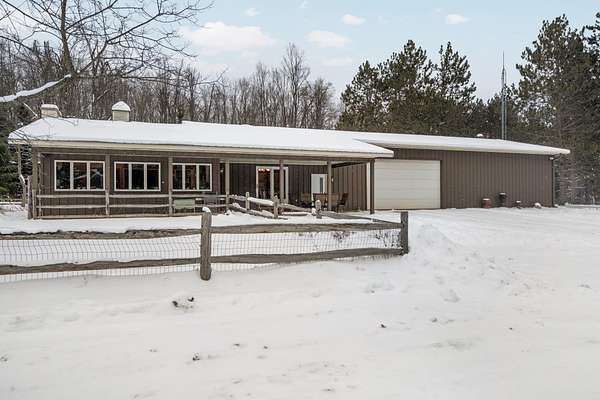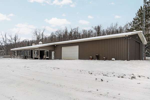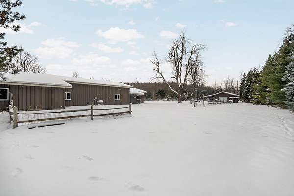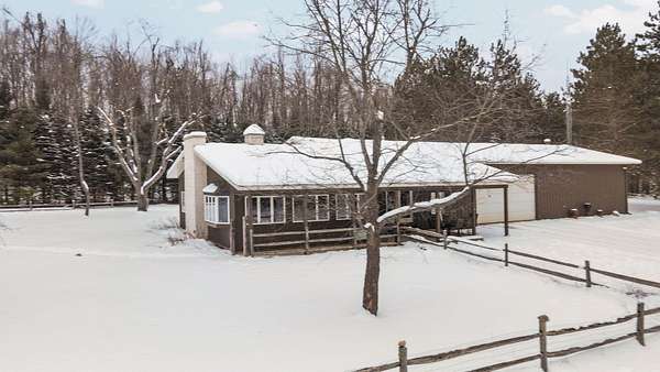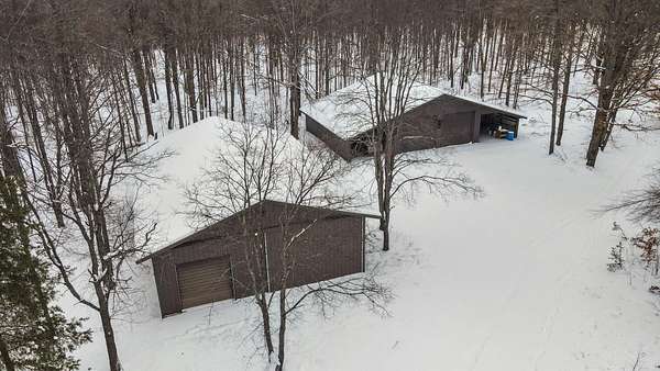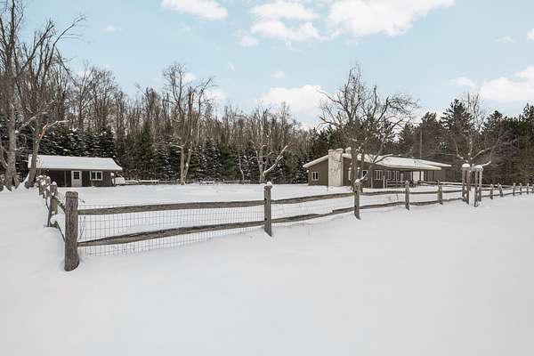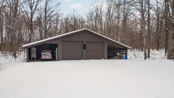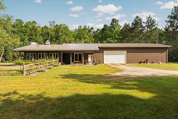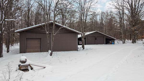 Discover unparalleled seclusion and versatility with this 3-bedroom home set on 80 beautifully wooded acres. Designed for comfort and functionality, the interior features an inviting open layout with vaulted ceilings, a striking stone fireplace, and a spacious owner's suite with its own walkout to the yard. High-speed internet ensures you stay connected while enjoying the peaceful surroundings. A true standout is the oversized, 4-car attached garage, with its own bathroom, & a finished bonus room that can serve as a hobby space, office, or playroom. Outdoors, the fenced yard and garden beds are ready for planting, and the property includes two large pole buildings plus a finished shed This is the perfect blend of privacy, recreation, & modern convenience, all in one remarkable setting.