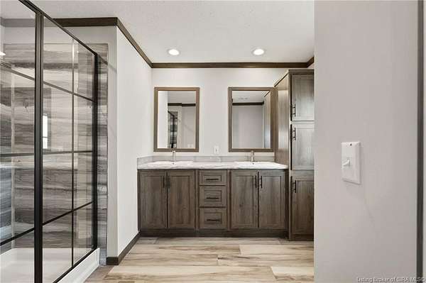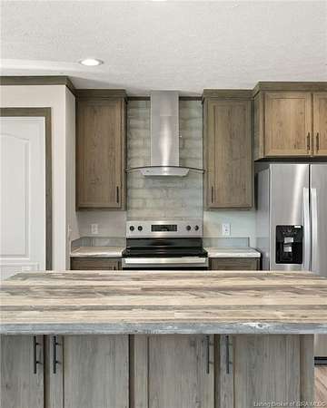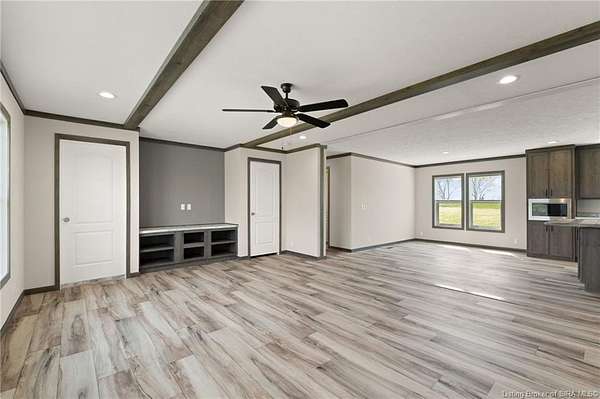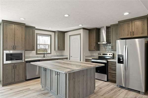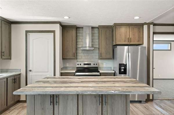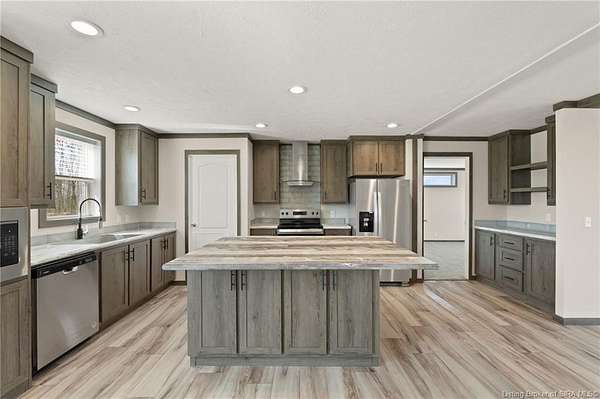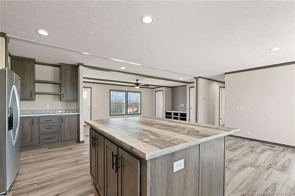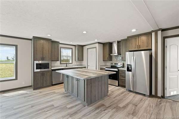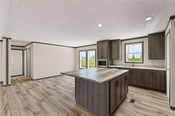 A built-in office area with a large, light-filled window provides an ideal workspace for remote work. At the heart of the home lies the dream kitchen, showcasing sleek laminate countertops, ample cabinetry, a pantry, a large island perfect for meal prep and entertaining, and modern stainless-steel appliances. The home's three-dimensional roof adds architectural interest, while the expansive flat acreage offers endless possibilities for outdoor living or future expansions.