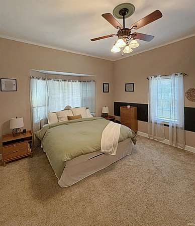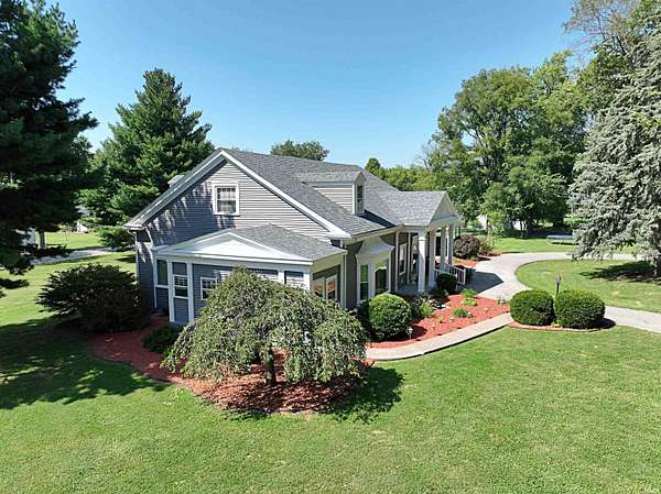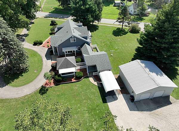 This exquisite home sits on over two acres +/- at the edge of town, offering the peaceful feel of country living while still enjoying sidewalk access to downtown. Located near the sports complex, schools, the city pool, and countless amenities, it’s the best of both worlds. A circle driveway leads you to an attached garage plus a large detached building, ideal for vehicles, hobbies, or storage. The yard is made for recreation—with wide open areas for play and gatherings, a volleyball court, plus shady spots under the mature trees where you can relax in the breeze. The outdoor living space is unmatched, featuring a covered patio with a built-in kitchen, grill, seating area, and TV. Multiple covered porches provide even more options to enjoy the outdoors year-round. Inside, you’re welcomed by a gracious foyer with hardwood floors and a beautiful staircase. The main level includes a spacious living room with built-in bookshelves and a gas fireplace, opening into a four-season sunroom with French doors. The dining room, also with French doors, flows right into the outdoor living area—perfect for entertaining. A cook’s kitchen with a bar, a half bath, a laundry/utility room with generous storage, and an elevator complete the first floor. The primary bedroom suite offers abundant closet space, while a second large bedroom on the main level provides flexibility. Upstairs, discover two extra-large bedrooms designed with kids (or kids-at-heart) in mind—featuring dormer windows, cozy nooks, built-in drawers, and plenty of charm. A bonus game or reading area overlooks a lovely view, complemented by an additional full bath. From everyday living to entertaining, this home truly has it all—space, character, and an outdoor lifestyle that you dream of.