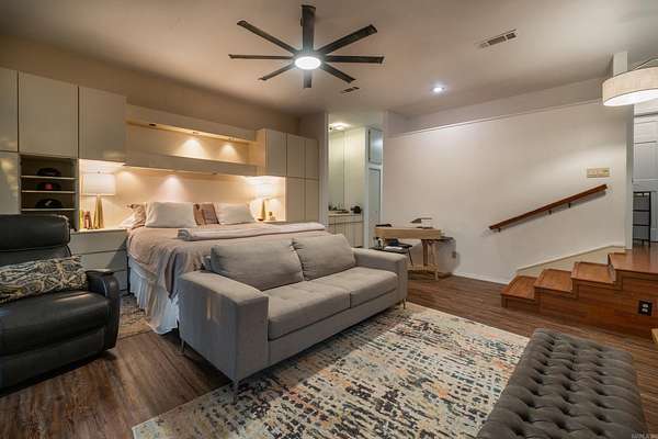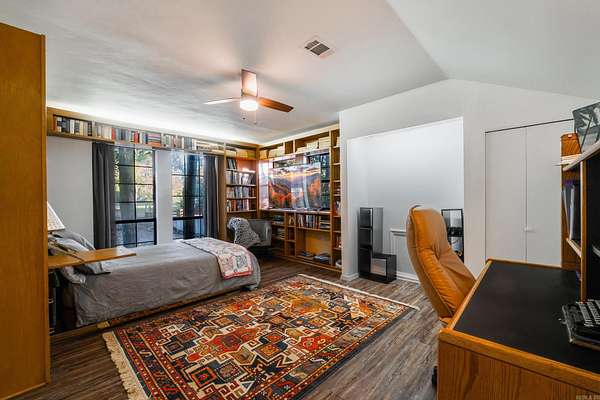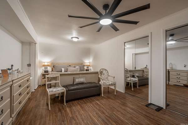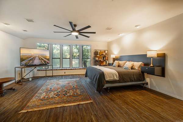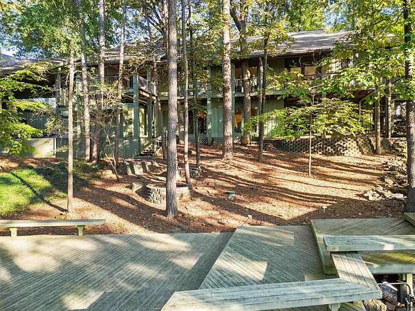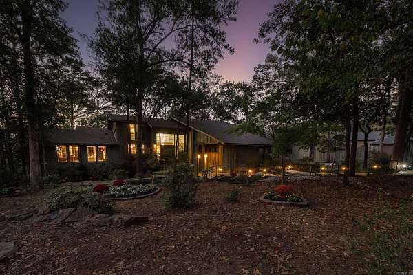 This one-of-a-kind mid-century modern home is full of character, light, and style! It is Conveniently located in the heart of Clarksville has access to the Spadra Creek Nature Trail. Offering over 6,000 sq ft of living space across three floors, plus a heated and cooled detached garage and showroom with a half bath, for a total of more than 8,500 sq ft. Inside you'll find 5 bedrooms, 3.5 baths, and an office, all filled with windows that bring in natural light throughout. The main bedroom features a cozy fireplace, doors that open up to a covered porch, perfect for relaxing, and a large bathroom ensuite. A convenient elevator connects the main and lower level for easy access. Unwind on the expansive decks and porches, with a BEAUTIFUL view that makes you feel like you are on a retreat. The thoughtful design and character makes this home truly unique.