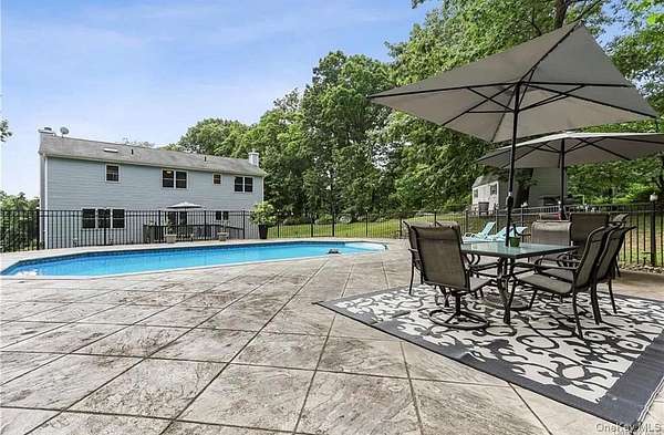 Awesome stone front colonial on 3.2 private acres at the end of the cul-de-sac. Magnificently updated gourmet kitchen including quartz countertops & backsplash, porcelain floors, stainless steel appliances & wine cooler. Built in 2003, this home offers exceptional privacy and a peaceful setting while remaining convenient to local amenities. The home features four spacious bedrooms and 2.5 bathrooms, with a classic layout designed for comfortable everyday living and effortless entertaining. The main level includes a sun-filled living and family room with a cozy fireplace, a formal dining room, and a recently renovated kitchen and updated bathrooms with modern finishes. The primary suite features a custom walk-in closet, creating a relaxing private retreat. Step outside to your backyard oasis, oversize shed, complete with a fenced in-ground pool with gas heater and an exterior deck with a dedicated gas line for grilling, perfect for outdoor entertaining. Additional highlights include leaf gutter guards and a chandelier lift, offering thoughtful upgrades and convenience throughout this exceptional property.