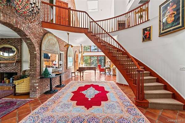 As you enter through the all-brick veranda-style cathedral entrance, you're greeted by a grand formal living room with soaring ceilings and a dual-purpose spiral staircase. This staircase, which adds a touch of opulence, leads to both the master suite and other exquisite living spaces. The home is beautifully appointed with Tiffany chandeliers that are permanently fixed, creating an air of sophistication and grace.