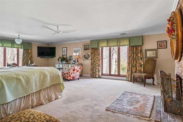 The residence boasts four stunning fireplaces, including one in the master bedroom, adding warmth and charm to every room. Three of the bedrooms are en-suite, complete with luxurious sliding doors that open to wraparound balconies, offering serene views and ample natural light. The master bedroom is a true retreat, featuring a separate suitcase closet upstairs, a large walk-in closet, and a lavish master bath with a soaking French claw tub, bidet, and tower towel warmer for added comfort.