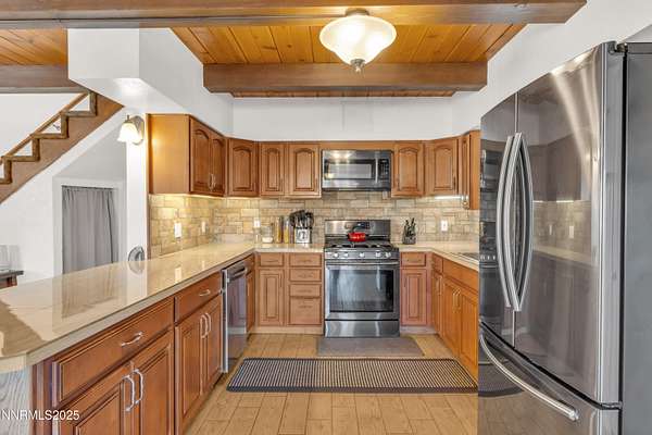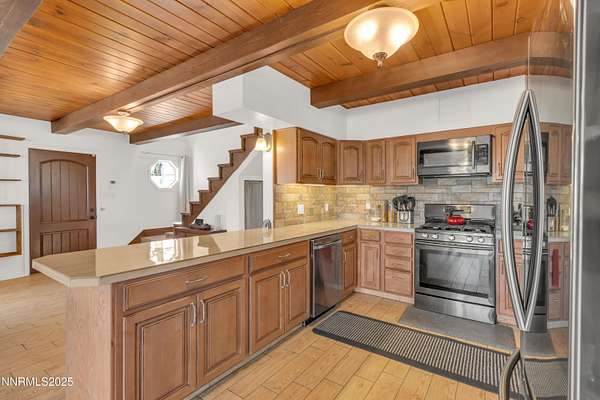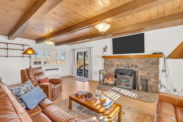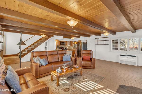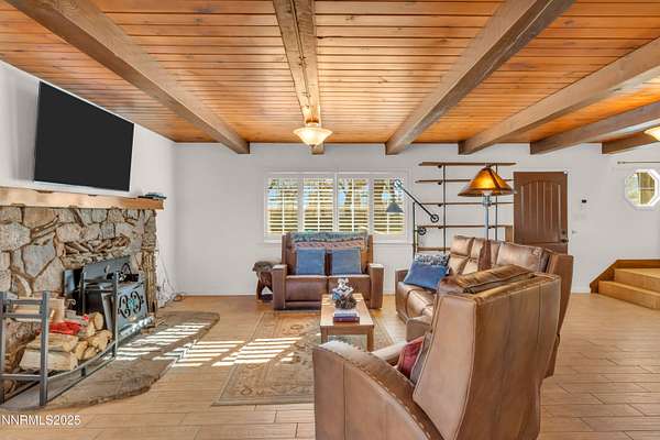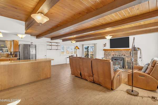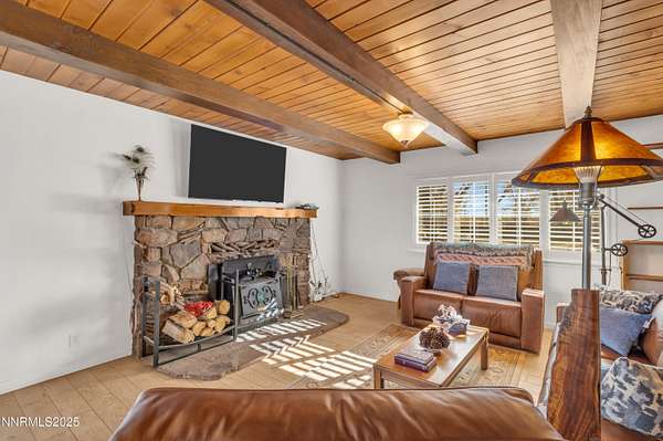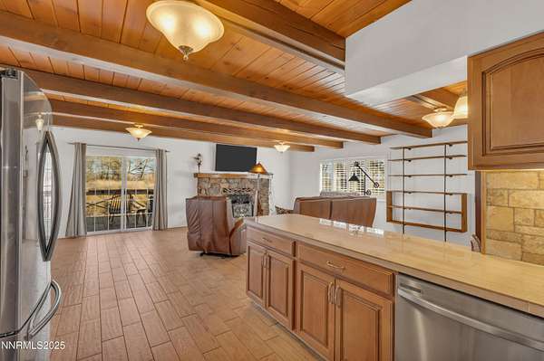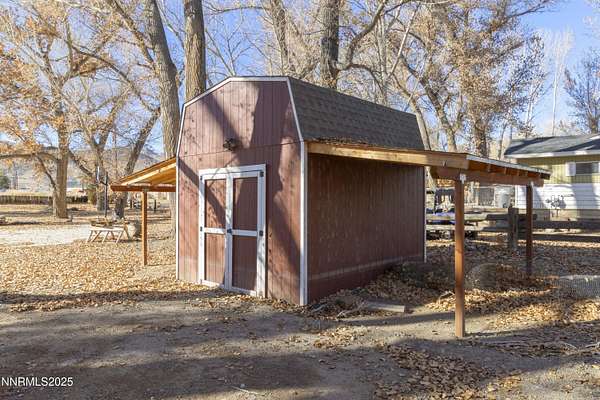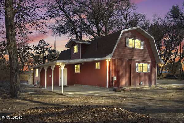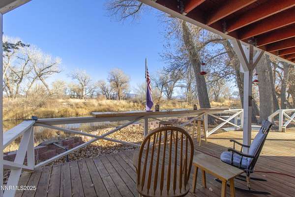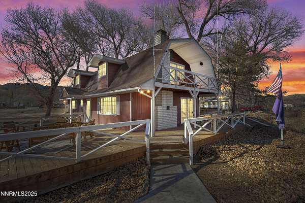 Welcome to your own private riverfront retreat, set on approximately 1.7 acres in a peaceful, park-like setting along the Walker River. This unique barn-style home offers a rare blend of tranquility, space, and thoughtful upgrades throughout. The home has been extensively renovated and features a main-level primary suite with a large walk-in closet, a brand-new kitchen with new appliances that stay with the home, updated bathrooms, newer flooring, windows, doors, and fixtures. The kitchen has been refreshed with sheetrock and mold-resistant materials, and the home includes updated electrical panels with 200-amp service. All outbuildings are insulated and have electricity, providing excellent flexibility for storage, workshops, or hobby space. Enjoy outdoor living with new decking and railings, expanded walkways, new patios, and mature landscaping throughout the property. A lasered flood wall has been added with a river overlook platform, creating the perfect spot to relax and take in the water views. RV parking with electric and sewer hookups adds even more functionality. The property also includes a large 1,070 sq ft shop and a 28' x 12' outbuilding ideal for additional storage or a mancave/she-shed. With plenty of room to spread out, entertain, or simply enjoy the peaceful surroundings, this property offers a rare lifestyle opportunity that's hard to find. A definite must-see.