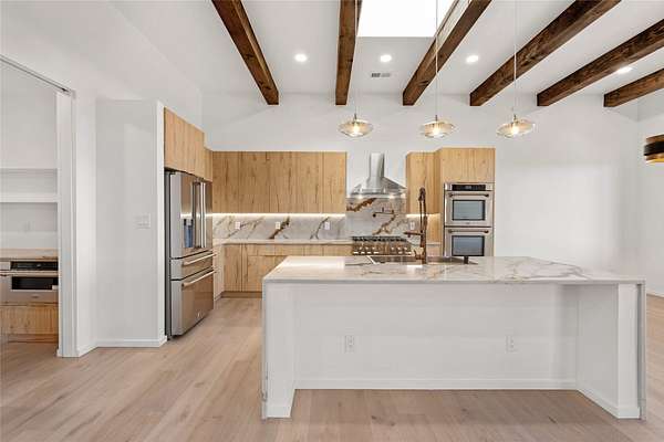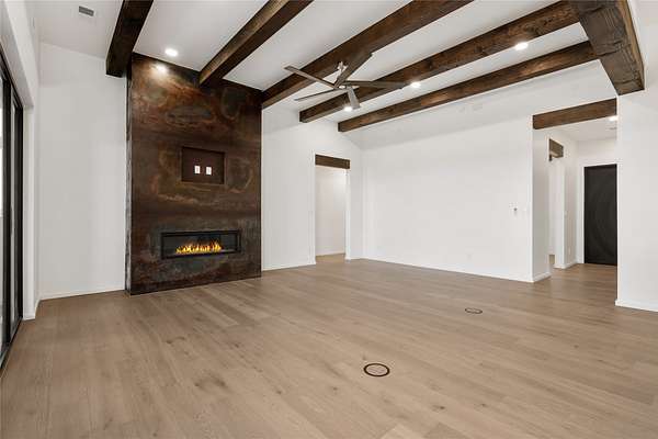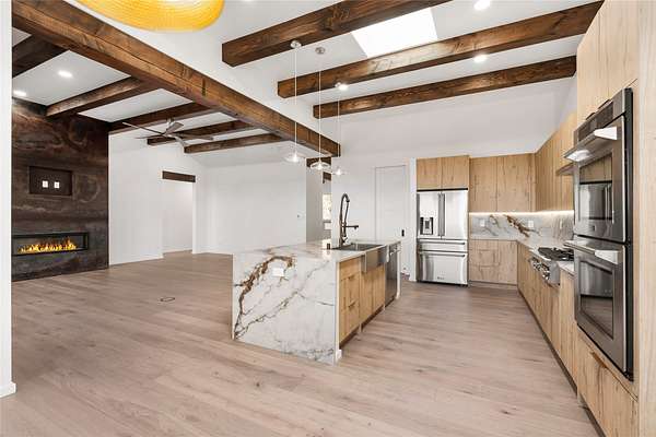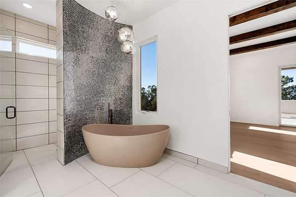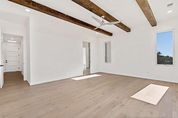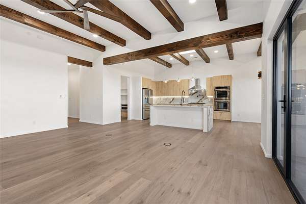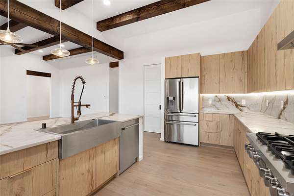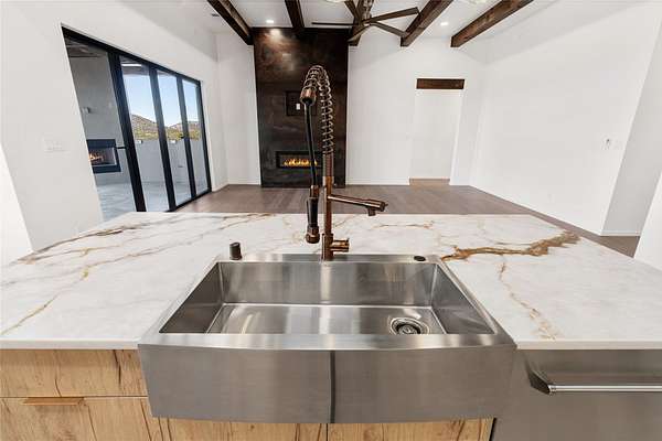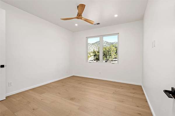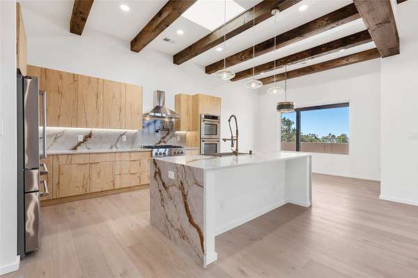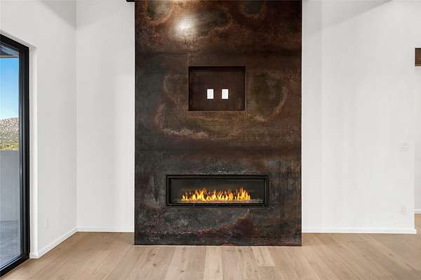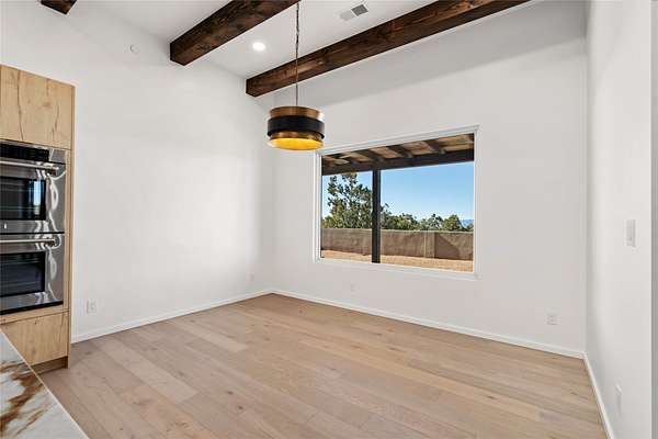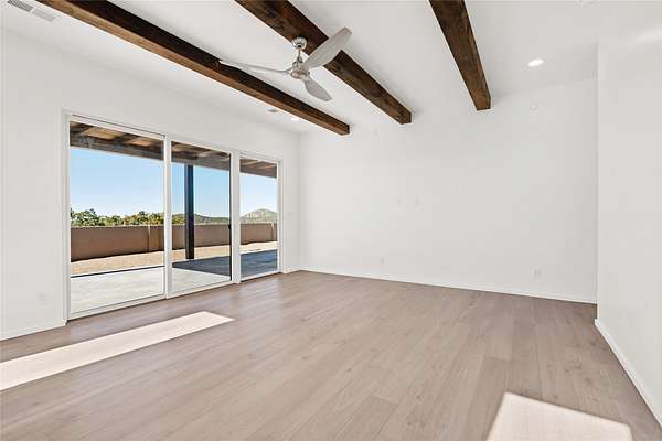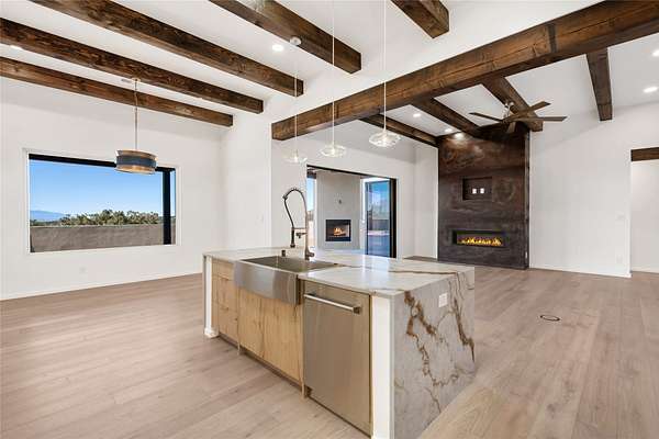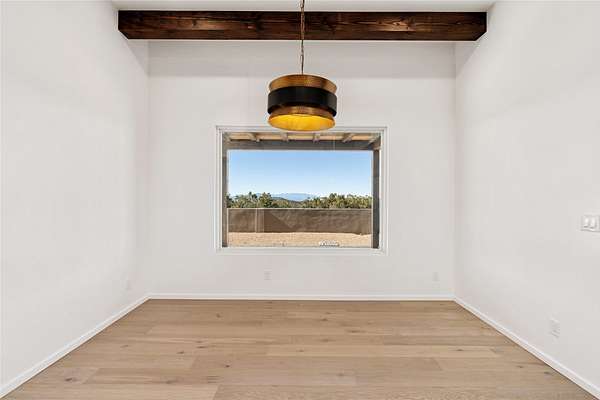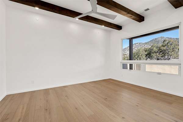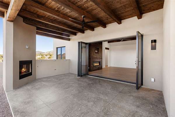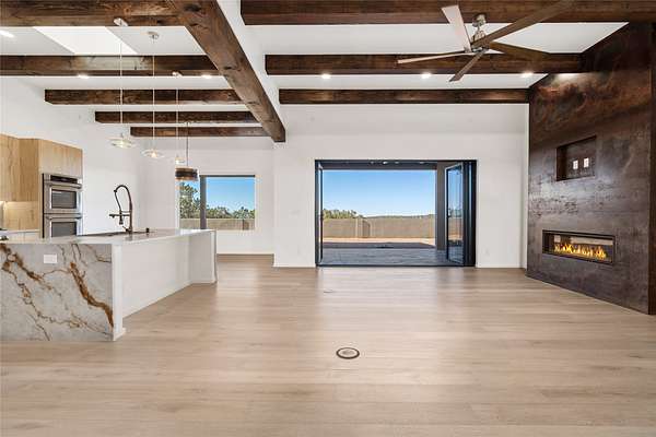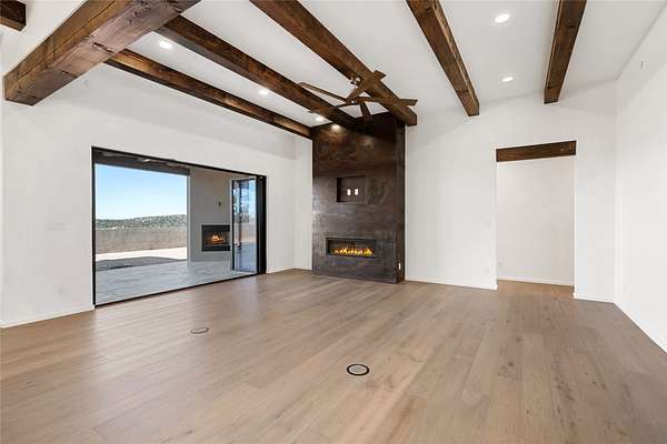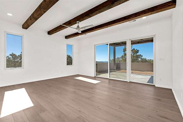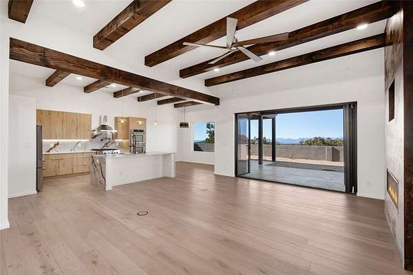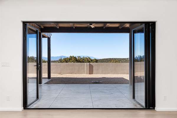 Set on 2.6 acres with sweeping desert and mountain views, this beautifully crafted 2,794-square-foot new home blends clean modern design with timeless Santa Fe style in the sought-after Longview community. Recently completed, the home offers 3 bedrooms, 3.5 baths, a dedicated office, media room, and spacious 3-car garage, thoughtfully designed for both comfort and functionality. Warm natural materials, wood beams, wood floors, and contemporary finishes reflect Santa Fe's unique architectural heritage. The open-concept floor plan features light-filled living spaces, a chef's kitchen with ZLINE appliances, and a butler's pantry, creating an ideal setting for everyday living and entertaining with seamless indoor-outdoor flow. The private primary suite offers a spa-inspired bath and direct access to outdoor living areas that capture the beauty and tranquility of the surrounding high desert landscape. This recently completed custom home presents an exceptional opportunity to own a brand-new residence with expansive views in one of Santa Fe's most desirable high desert communities.