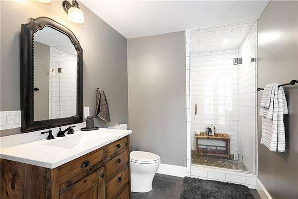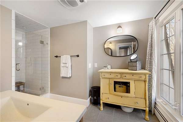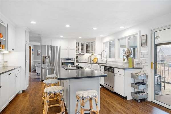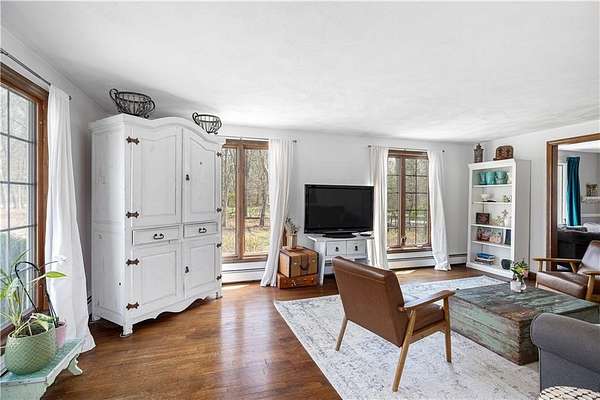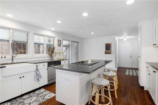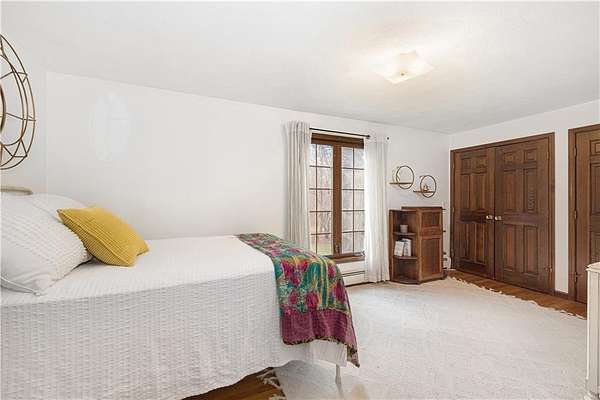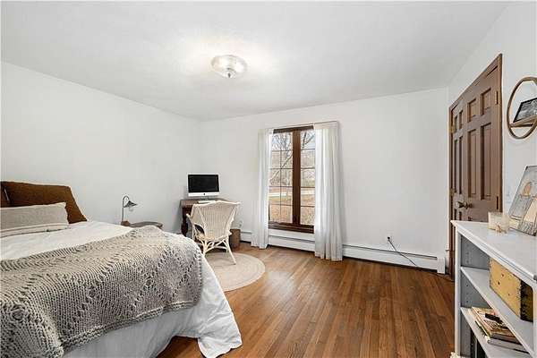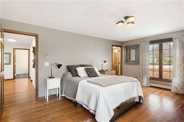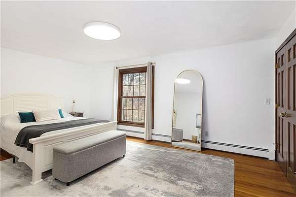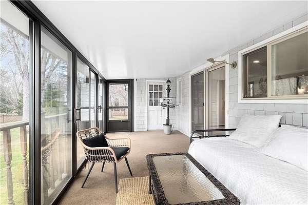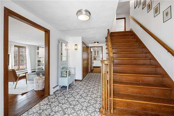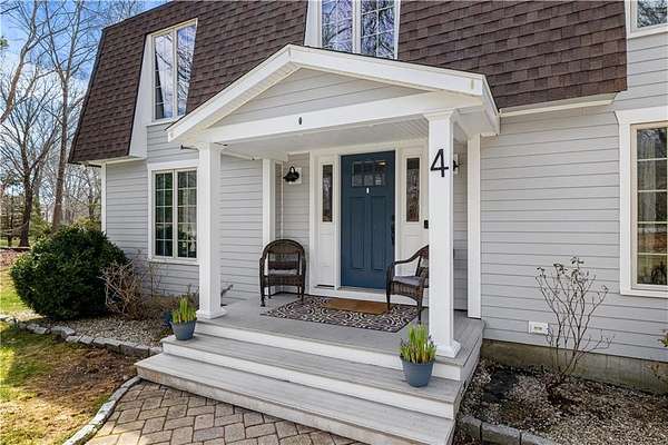 Spacious colonial within highly sought after East Passage Estates offers perfect blend of comfort, modern updates & prime location, deeded access to Cranston Cove Beach & Rainbow Ponds. Almost 2 acres, set back behind grove of trees with convenience of circular driveway & new covered front porch entryway with decorative front siding. Beautifully renovated eat-in kitchen, large center island, quartz countertops, farmhouse sink & SS appliances. Formal DR adds touch of elegance to every meal with brick FP, wood storage nook & dry bar area. Warm hardwood floors create thoughtful balance of style & comfort throughout where you can gather in spacious front LR or sitting area that could be home office. Freshly painted primary suite with ensuite BA, oversized stall shower with white subway tile & stone pebble floor for added luxury. The 3 additional BR's offer spacious rooms & plenty of closet space plus additional full BA with double sinks, decorative tile floor & tile shower. Extra large, 2nd-floor, rec room with built-in bookshelves that offers plenty of space for relaxation or entertainment, could serve as guest suite. Inviting 3-season porch provides ideal spot to savor peaceful surroundings & coastal breezes. Additional highlights include full basement for storage or future expansion, 2-car garage & level & fenced backyard. All that Newport has to offer is nearby & easy commute to Providence, Boston or NYC.