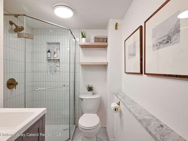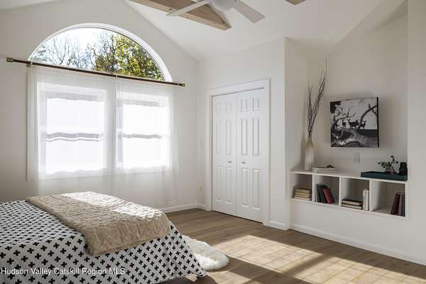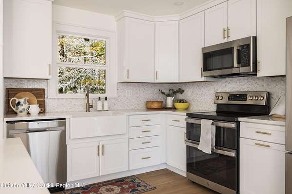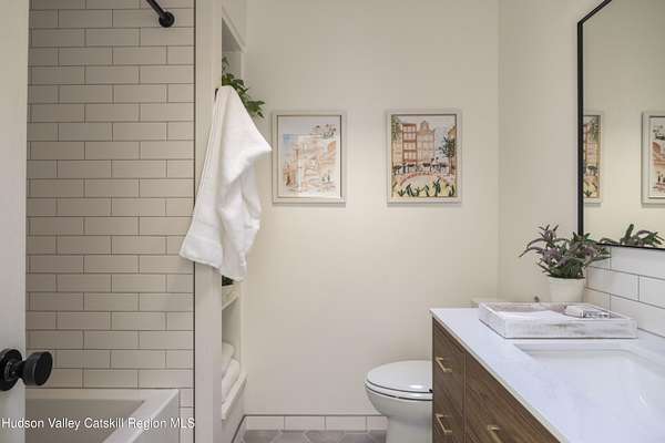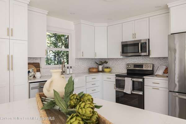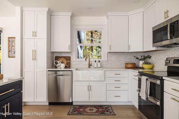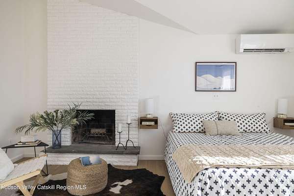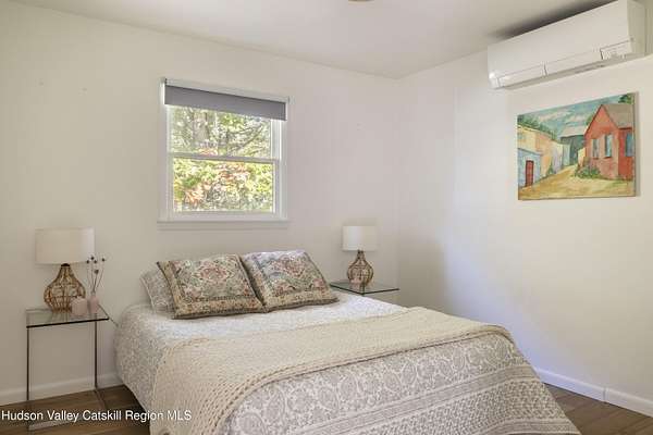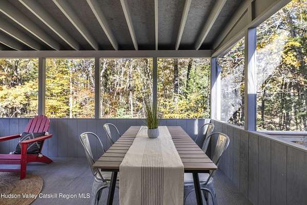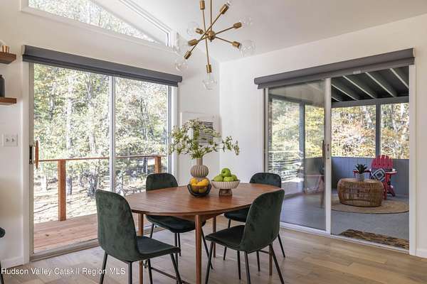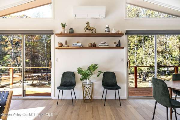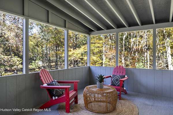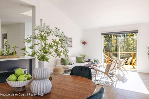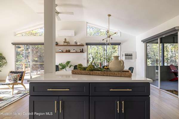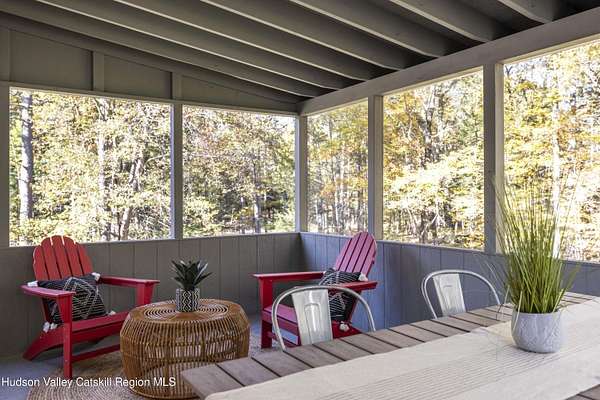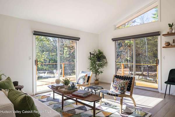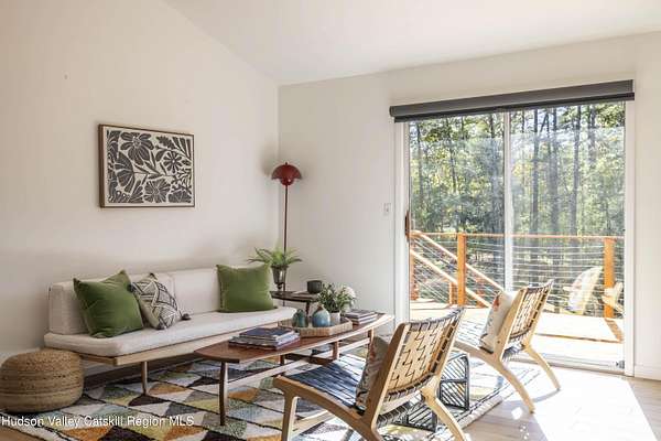 Highwoods Haven rests on just over two quiet acres where sunlight filters through tall hardwoods and birdsong fills the air. Although the setting feels miles from anywhere, the property lies barely five minutes from Woodstock's Village Green and within a short, scenic drive of Kingston and Saugerties. A comprehensive 2021 renovation infused the four-bedroom, two-bath residence with modern comfort while preserving its artistic soul. Former owner and Woodstock author Helen Weaver once welcomed Jack Kerouac, Allen Ginsberg, and other luminaries beneath this very roof. Step through the front door and an airy great room unfolds - chef's kitchen, dining area, and living space flowing together beneath vaulted ceilings. Four glass sliders invite daylight to wander inside, then open wide to an expansive wrap-around deck and a deep screened porch. Mornings begin with coffee among the treetops, afternoons drift into alfresco lunches in summer shade, and evenings conclude with cocktails under a sky alive with stars. Inside, rich oak floors and understated finishes lend warmth without distraction, allowing the surrounding landscape to remain the home's quiet centerpiece. The bi-level layout is thoughtfully conceived for flexibility and privacy. Upstairs, a generous primary suite accommodates a king bed; one enjoys the romance of a wood-burning fireplace that casts a golden glow on winter evenings. A spa-style bath, finished in polished stone and brushed brass, serves this level with a deep soaking tub that invites an unhurried exhale. On the main floor, two additional bedrooms offer space for guests or a dedicated office, sharing a crisp, contemporary bath that echoes the home's calm aesthetic. Downstairs, a second living area gathers friends around a vintage cast-iron stove whose gentle heat amplifies the invitation to linger over movies or board games when snow drifts beyond the windows. There is a second primary suite bedroom with a bath, allowing guests to choose which floor to rest on. Comfort is engineered into every detail: a high-efficiency heat-pump system installed in 2023 provides room-by-room climate control; a brand-new well delivers excellent pressure; and smart-home technology allows you to adjust temperature or lighting from anywhere in the world. Life at Highwoods Haven extends well beyond its walls. Three minutes down the lane, members-only Zena Recreation Club offers a pool, tennis courts, and year-round community events. Trailheads leading to hidden waterfalls, glass-clear swimming holes, and protected nature preserves lace the surrounding hills. At the same time, farm-to-table restaurants, galleries, and live-music venues sustain Woodstock's legendary creative heartbeat. Rhinecliff Amtrak lies twenty minutes away, placing New York City less than two hours from your front door. In a region celebrated for its harmony of culture and wilderness, Highwoods Haven stands apart - private yet convenient, historic yet turnkey, effortless yet inspiring. It is a home designed not merely to be occupied, but to be experienced, savored, and remembered. A 3D Walkthrough Tour is available in the digital Lookbook or by request from the listing agent.