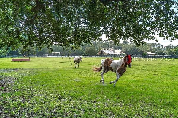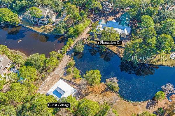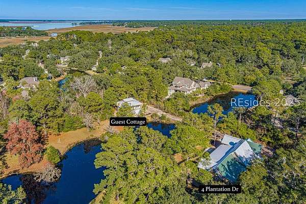 A rare opportunity, nestled on over 2 acres in popular Sea Pines. This Lowcountry, custom estate features a private, detached multi-purpose cottage, quietly located in the rear of the property, accessed exclusively by a land bridge. A beautifully curated 5 bedroom compound, set among majestic live oaks and pines, offers a sanctuary with single level living on the main floor, a private lagoon, pool/spa along with multiple outdoor spaces, ideal for entertaining. Throughout the main living areas you'll find rich hardwood floors, beautiful trim details and walls finished in sophisticated, classic neutral tones-creamy whites and warm taupes. The kitchen sets the tone of the home with natural dolomite countertops, taupe perimeter and island cabinets with custom arched oak upper cabinets flanking the range, complete with pure brass hardware. The mix of traditional selections is balanced with a modern, linear light fixture over the island. The scullery kitchen provides ample prep space and storage in addition to a dedicated pantry. Enjoy mixing cocktails in the well appointed wet bar with floating shelves and knurled brass plumbing. Features in the bathrooms include timeless marble mosaics paired effortlessly with curated ceramics complete with custom cabinetry and classic hardware selections. This commitment to mixing the traditional with modern, high-end selections guarantees a home that will never go out of style. Experience working remotely in the study featuring custom built-in desks. Dramatic, cathedral ceilings make the home feel larger than life. A media room invites you to relax and linger. Details abound with ceilings trimmed in tongue and groove, shiplap walls, custom wood stained wall paneling, arched built-ins, custom built-in office. The versatile guest cottage welcomes friends and family, featuring a living room, wet bar, bedroom, full bathroom, and additional garage space for up to three vehicles. An expansive screened porch enhances the outdoor experience, making it perfect for gatherings such as oyster roasts or bourbon tastings, or simply relaxing while enjoying the picturesque natural surroundings. Experience a home that seamlessly integrates classic design with modern living amidst the scenic beauty rooted in Lowcountry heritage.This property offers a unique experience of residing on a secluded estate with world-class amenities including golf, tennis, stables, a nature preserve, restaurants and shops just a stroll away.