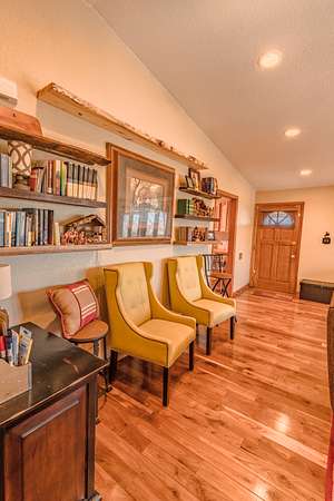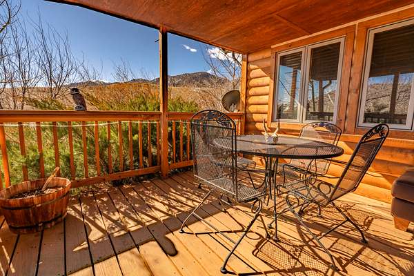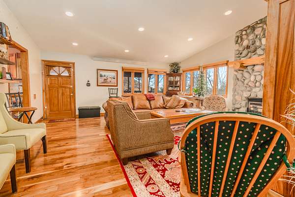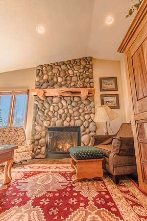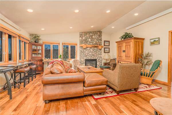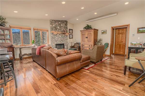 The cabin itself is a timeless Wyoming classic, featuring 3 bedrooms, 3 full bathrooms, and warm wood finishes throughout that create a cozy, inviting atmosphere. Step inside to find an open galley kitchen with pine cabinetry, modern appliances including a gas stove, microwave, refrigerator, and dishwasher. The living room boasts hardwood floors, a striking stone fireplace with a rustic mantel, and large windows that frame panoramic mountain views, filling the space with natural light. Leather seating, built-in cabinetry, and thoughtful decor add to the cabin’s charm, while the layout provides comfortable living spaces for relaxation after a day of adventure.