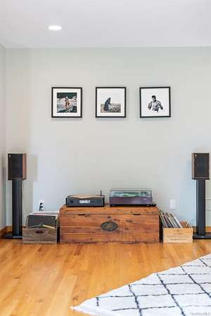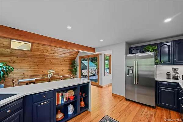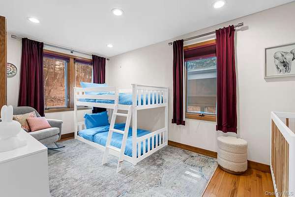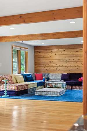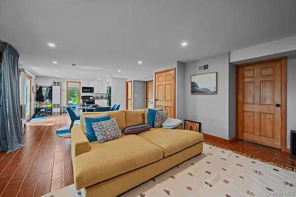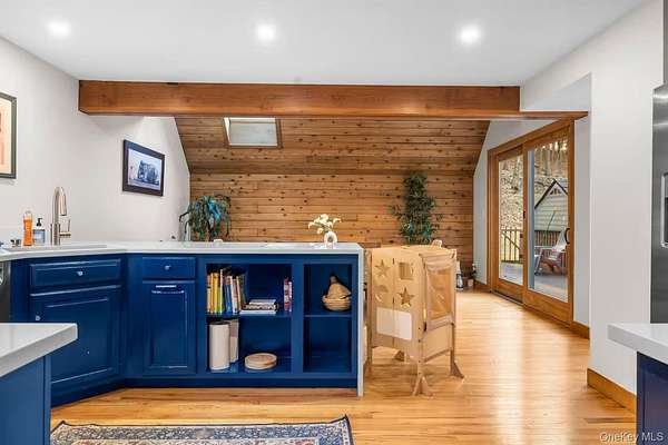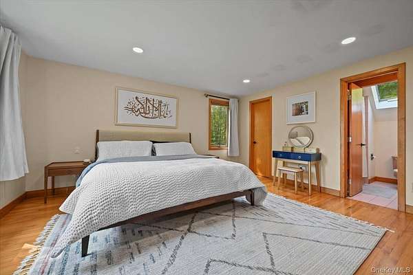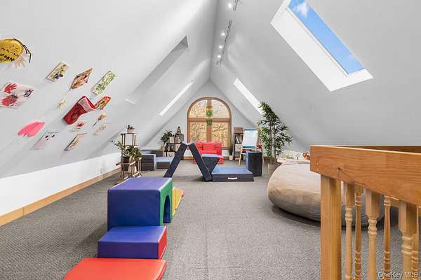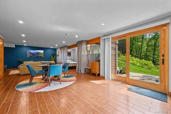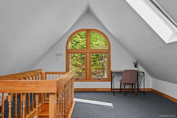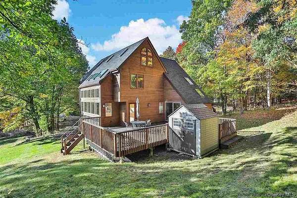 Welcome to The Skytop Lodge, a custom contemporary house nestled in the heart of the Shawangunk Mountains. This Acorn Deck Design home was thoughtfully sited to follow the sun's path. With forty-eight windows, glass doors, and skylights, the interiors are bathed in natural light from dawn to dusk. Set on nearly three acres on a quiet cul-de-sac, the property offers privacy and convenience, just minutes to the Village of New Paltz, historic Mohonk Mountain House, and miles of preserved trails and parkland. Inside, oak floors flow through much of the home. The chef's kitchen with breakfast bar invites both casual meals and lively entertaining, while a spacious Trex deck extends living outdoors for grilling, dining, relaxing, and soaking in the surrounding beauty. The main floor also includes a guest bath, large pantry, living room, dining room, and sunroom. The second level hosts three bedrooms, including a generous primary suite with tiled ensuite bath, plus an additional full bath. The third level, brightened with 5 skylights, provides flexible space for an office, yoga studio, playroom, or guest retreat. The walkout lower level functions as a private guest or in-law suite, complete with a kitchen, full bath, and oversized family room. From sunrise to sunset, this home reflects a deep connection to nature. The outdoor space contains woods, a 1 acre lawn, a play set, amazing hills for sledding, as well as two useful sheds. Peacefully sited on the edge of the woods yet close to town, it offers the perfect balance of tranquility and accessibility. In the heart of the Hudson Valley, you'll enjoy easy access to farmers markets, wineries, breweries, and some of the region's best hiking.