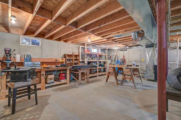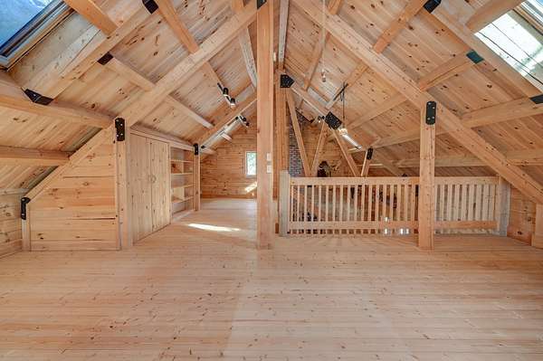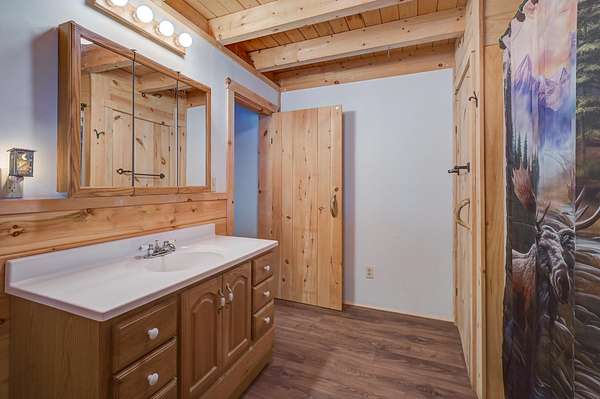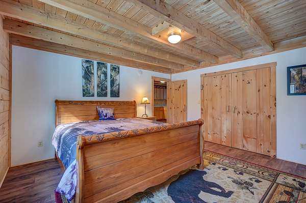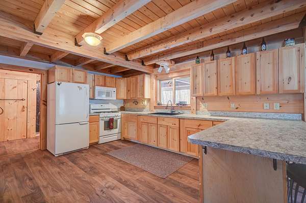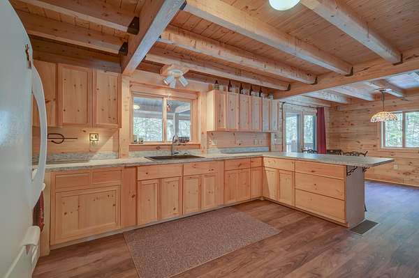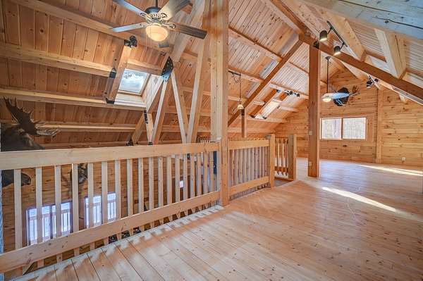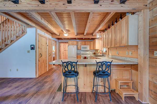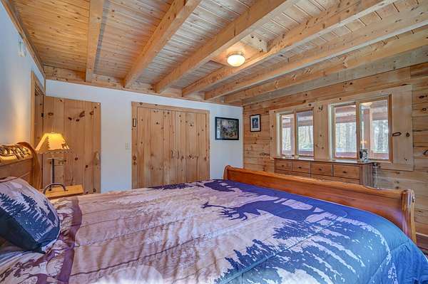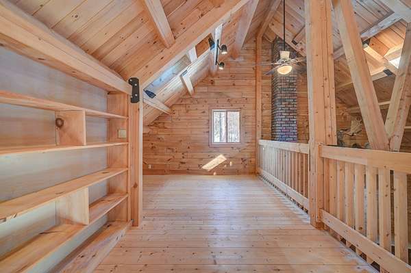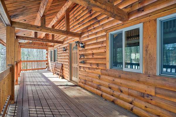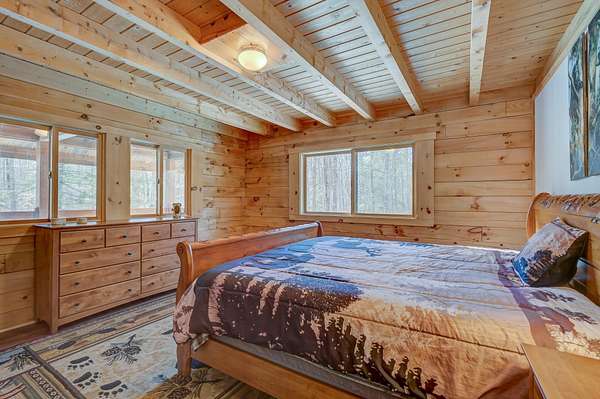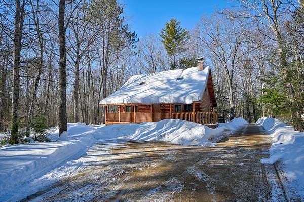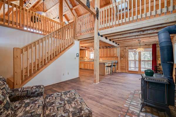 This log cabin is a dream for anyone who enjoys rustic charm and privacy. Nestled on nearly 2 acres, this 2-bedroom, 1-bath home offers a peaceful setting, plenty of room to enjoy the outdoors and the benefits of low taxes. Step inside to all new flooring throughout the entire first floor, cathedral ceilings and abundant natural light that enhance the open-concept layout, creating a bright and welcoming atmosphere. The living room features a wood-burning stove with a new chimney lining, providing cozy warmth for cold winter or cool fall nights. From the dining area, large glass doors lead to the covered back porch that runs the length of the home, making it an ideal spot for relaxing, entertaining, or taking in the surrounding nature. The kitchen offers natural wood cabinetry and ample storage, continuing the home's warm, cabin-inspired aesthetic. The primary bedroom is conveniently located on the first floor and features large windows that frame out the view to the front yard. A full bathroom completes the main level. Upstairs, an oversized bedroom offers built-in shelving, a closet and a bonus space that could serve as a home office or reading nook. A spacious basement provides great potential for future finished living space, a workshop, or hobby area, along with ample storage. Enjoy close proximity to hiking trails, lakes and year-round outdoor recreation, making this an ideal retreat for nature lovers and adventure seekers alike.