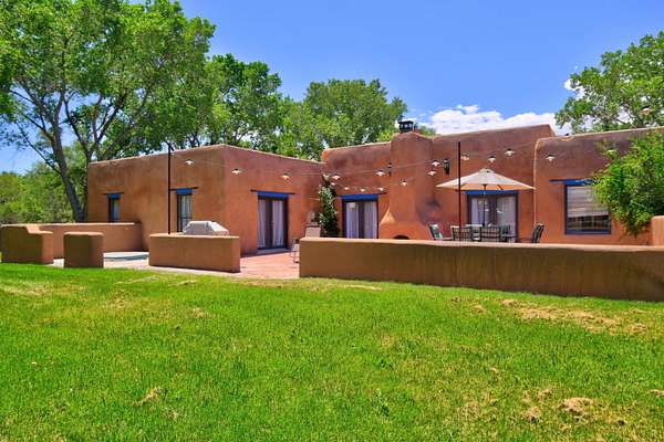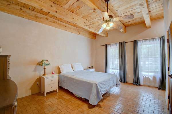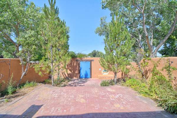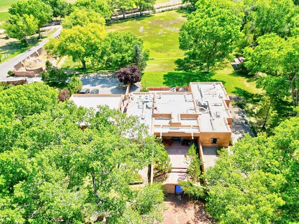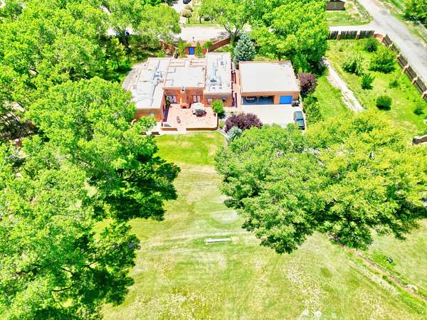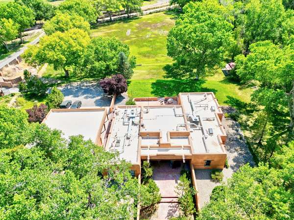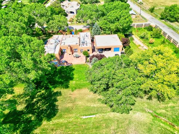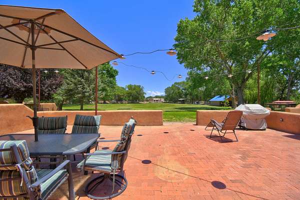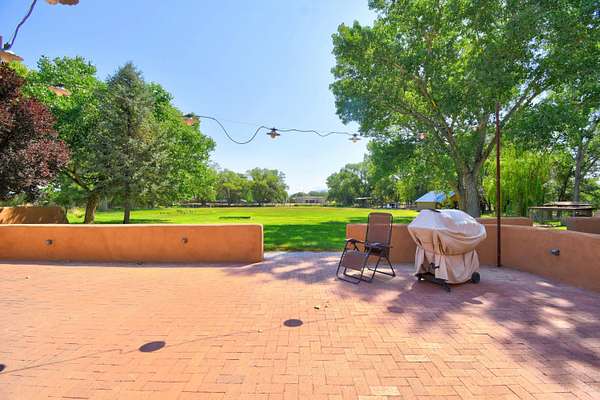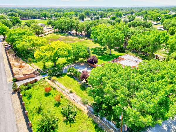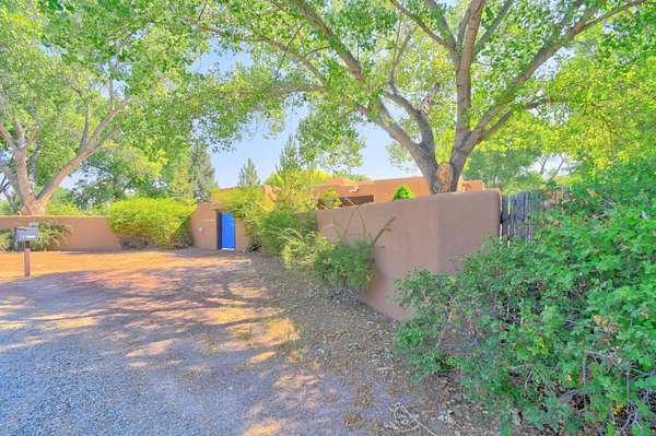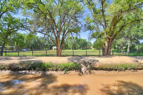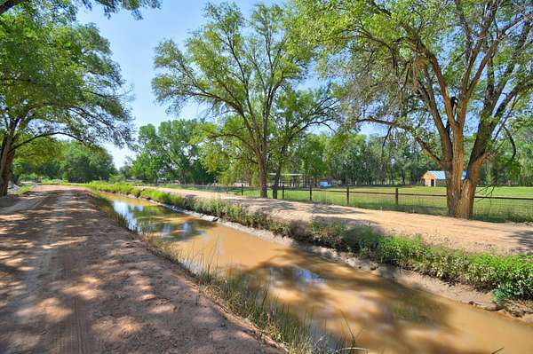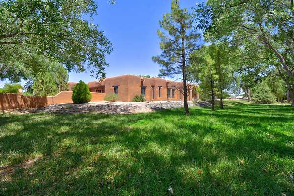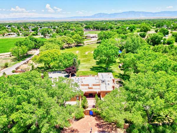 This magnificent Santa Fe style adobe hacienda is perfect for the most discerning buyers. Nestled under a cool canopy of Cottonwoods in this property in this secluded Bosque setting designed to showcase the beauty of this property. The home was constructed in the Pueblo-Revival style and built with authentic materials including adobe walls, beautiful brick floors, elegant timber ceilings, handcrafted doors, and hand troweled diamond finish plaster walls. The beauty of this home is in the elegance in simplicity of the natural materials. The lushly landscaped property consists of an open field, and direct access to the Otero lateral for irrigation. Water rights convey. Enjoy the serenity of the genteel country setting only 20 minutes away from Albuquerque. Freshly stuccoed. See list.