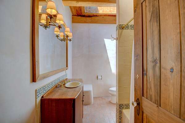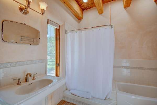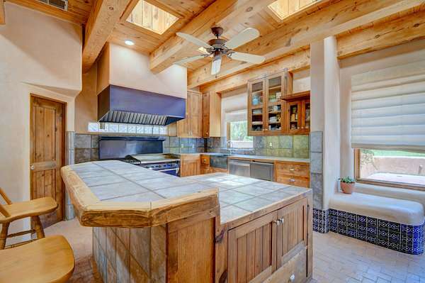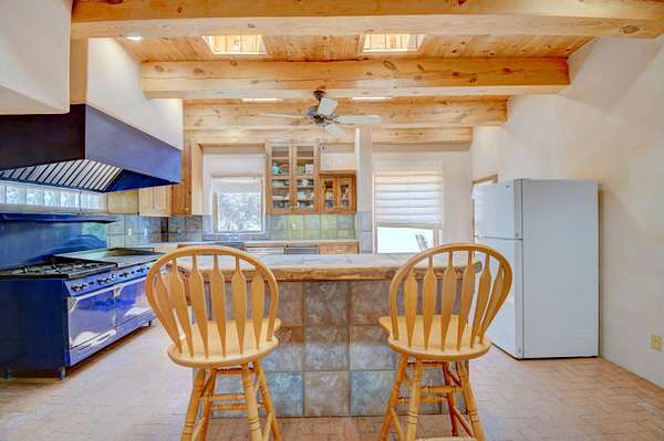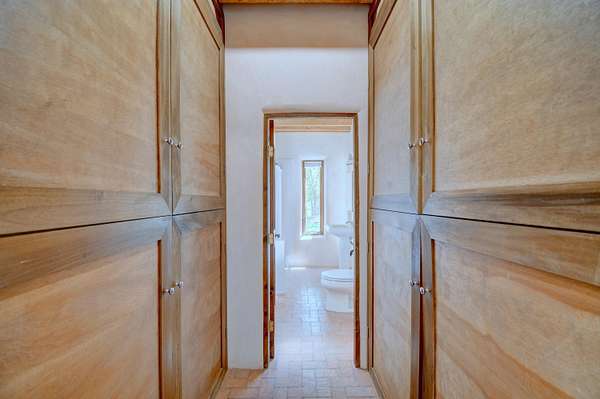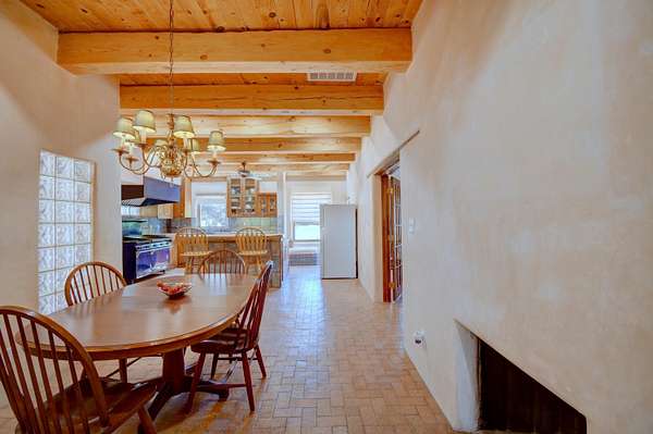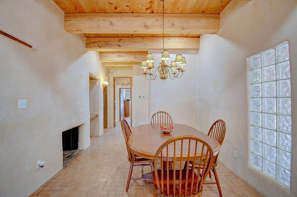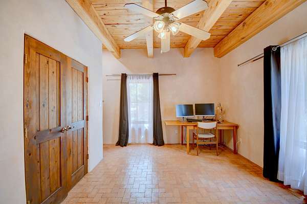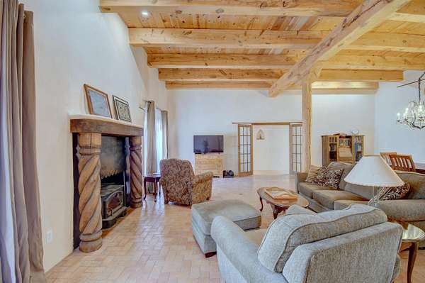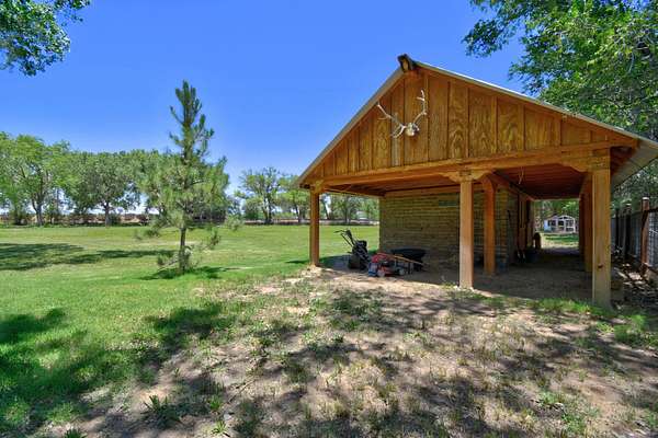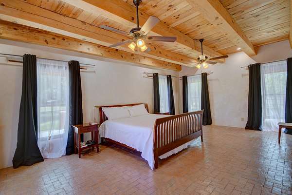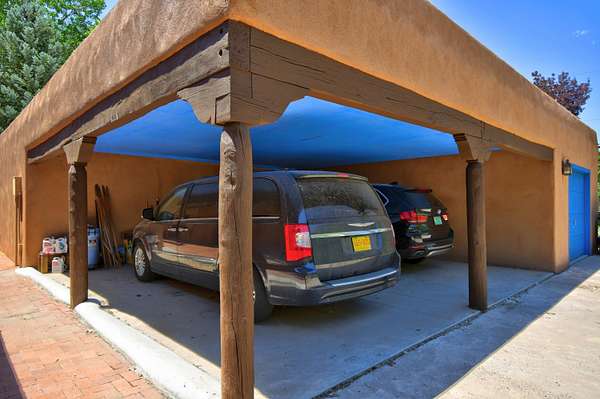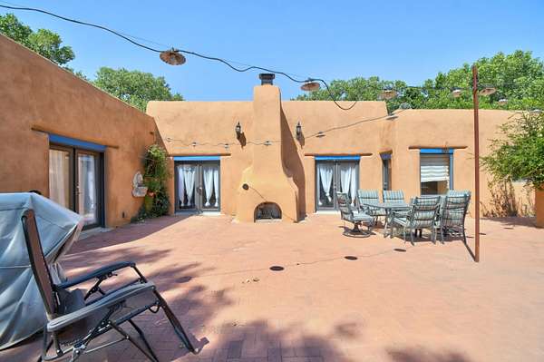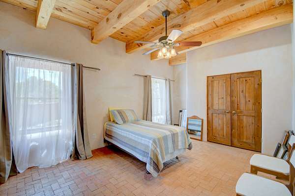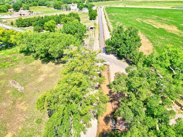 This magnificent Santa Fe style adobe hacienda is perfect for the most discerning buyers. Nestled under a cool canopy of Cottonwoods in this property in this secluded Bosque setting designed to showcase the beauty of this property. The home was constructed in the Pueblo-Revival style and built with authentic materials including adobe walls, beautiful brick floors, elegant timber ceilings, handcrafted doors, and hand troweled diamond finish plaster walls. The beauty of this home is in the elegance in simplicity of the natural materials. The lushly landscaped property consists of an open field, and direct access to the Otero lateral for irrigation. Water rights convey. Enjoy the serenity of the genteel country setting only 20 minutes away from Albuquerque. Freshly stuccoed. See list.