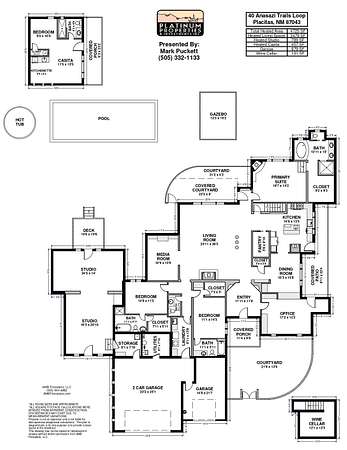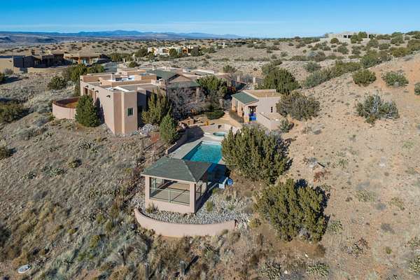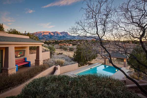 Stunning custom Placitas estate with sweeping Sandia and western views. Warm wood and tile floors, open living area with separate den, office with patio access, formal dining and breakfast room. Gourmet kitchen with Viking 6-burner range, fireplace, Sub-Zero appliances, double ovens, espresso maker, pot filler, butler's pantry, and prep sink. Primary suite with mountain views plus two guest suites. Resort-style outdoor living with pool, gazebo, flagstone patio, multiple decks. Casita with kitchenette and 3/4 bath. Wine cellar, oversized mudroom, 2 A/C units, tankless water heater (2024), and heated/cooled 789 sq ft studio with exterior access. Anasazi Trails offers tennis/pickleball court, chipping green & walking trails. Adjoining 1.36 acre lot available with house purchase for $180,000