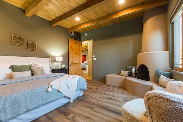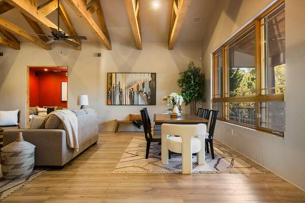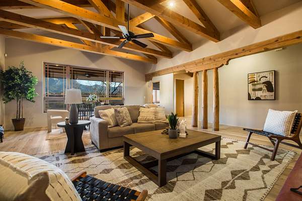 - Beamed Ceilings, Bookcases, Breakfast Area, Dual Sinks, Entrance Foyer, High Ceilings, Home Office, Jetted Tub, Kitchen Island, Living Dining Room, Main Level Primary, Multiple Primary Suites, Pantry, Separate Shower, Skylights, Utility Room, Walk In Closets, Water Closets